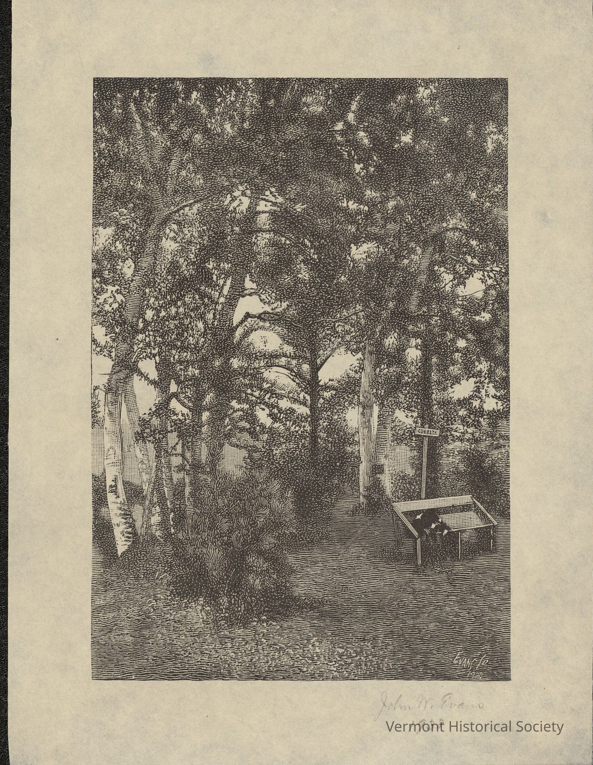 Woodcut print showing a landscape consisting of a close line of birch trees. There is a bench at the lower right of the composition, before the trees, with a small signpost that reads, "GGWRATH". It is signed in the lower right corner, "Evans /o 1938".
