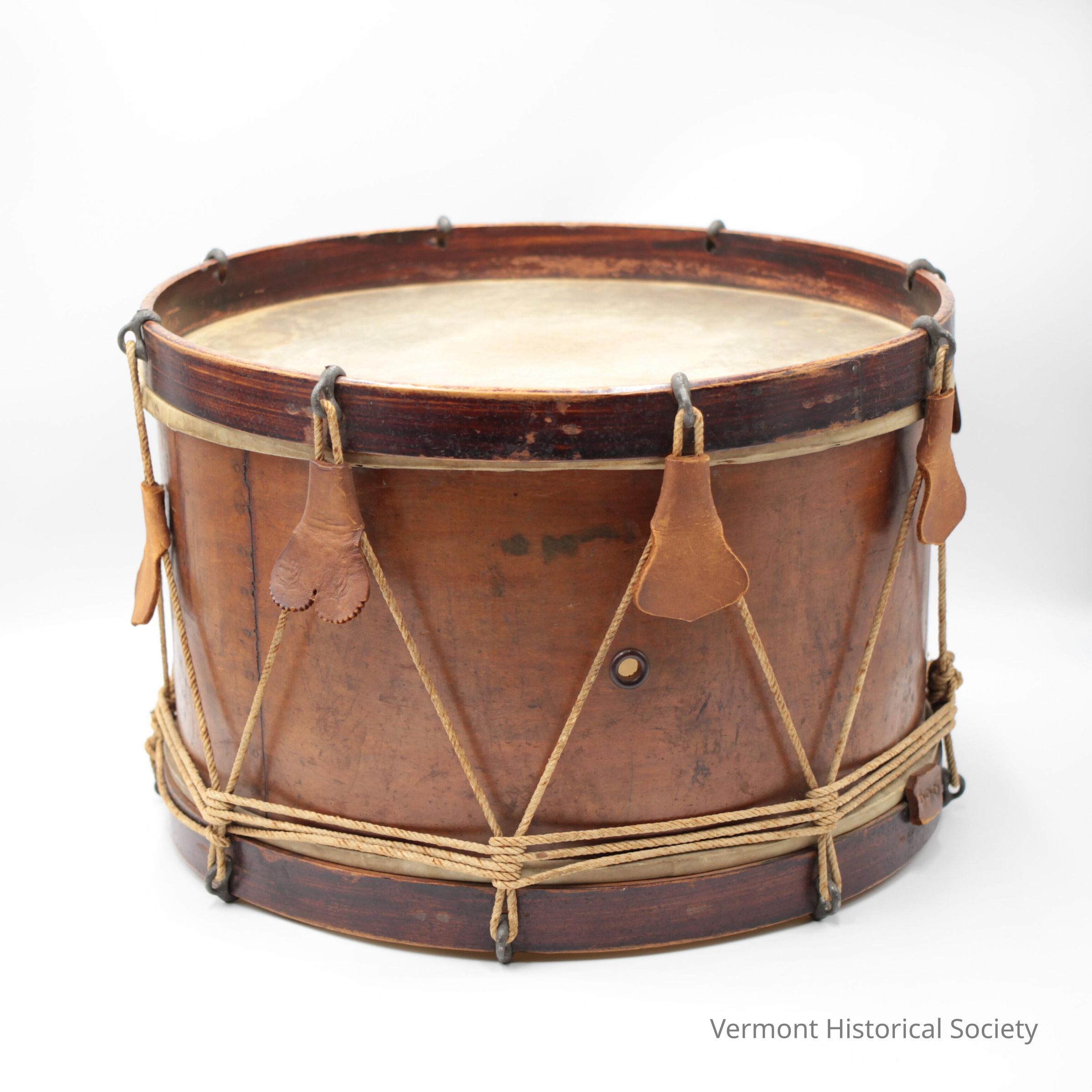 Side drum with maple shell. The shell is nailed at the seam with copper nails. The drum has an inner hoop of ash (about 15 mm wide). There is a vent hole in the side edged with horn. The drum has counterhoops made of dark-stained maple, each with eight holes for stringing rope. Each rim has eight iron hooks placed over the holes. Rope (not original) is strung in a zigzag pattern between the hooks. There are eight leather braces (four original). The original braces have two lobes with serrated edges and a flower design stamped onto each lobe. There are six gut snares, each with a leather tab at one end and a brass tensioner at the other end. The heads are vellum over wood fleshhoops. The drum has a printed label that reads, "Massachusetts Drum Manufactory John C. Haynes & Co., 33 Court Street, Boston wholesale and retail dealers in Sheet Music Musical Instruments and Musical Merchandise of every description Particular Attention Paid to Repairing Musical Instruments". Below the label is the handwritten inscription, "J. C. Haynes Co." in pencil.Context