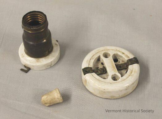 Three pieces of a ceiling lighting fixture consisting of a base (a), a socket (b), and a wire nut (c). The round base is made of porcelain with a metal bar across the center. There are two holes for mounting. The socket consists of a porcelain base with a round metal tube, molded into grooves at the top. The wire nut is round and white.Context