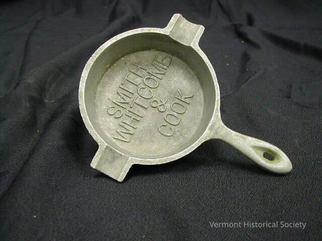 This is an ashtray that is shaped like a frying pan and has two spouts. The inside of the ashtray is molded with the text "SMITH WHITCOMB & COOK".