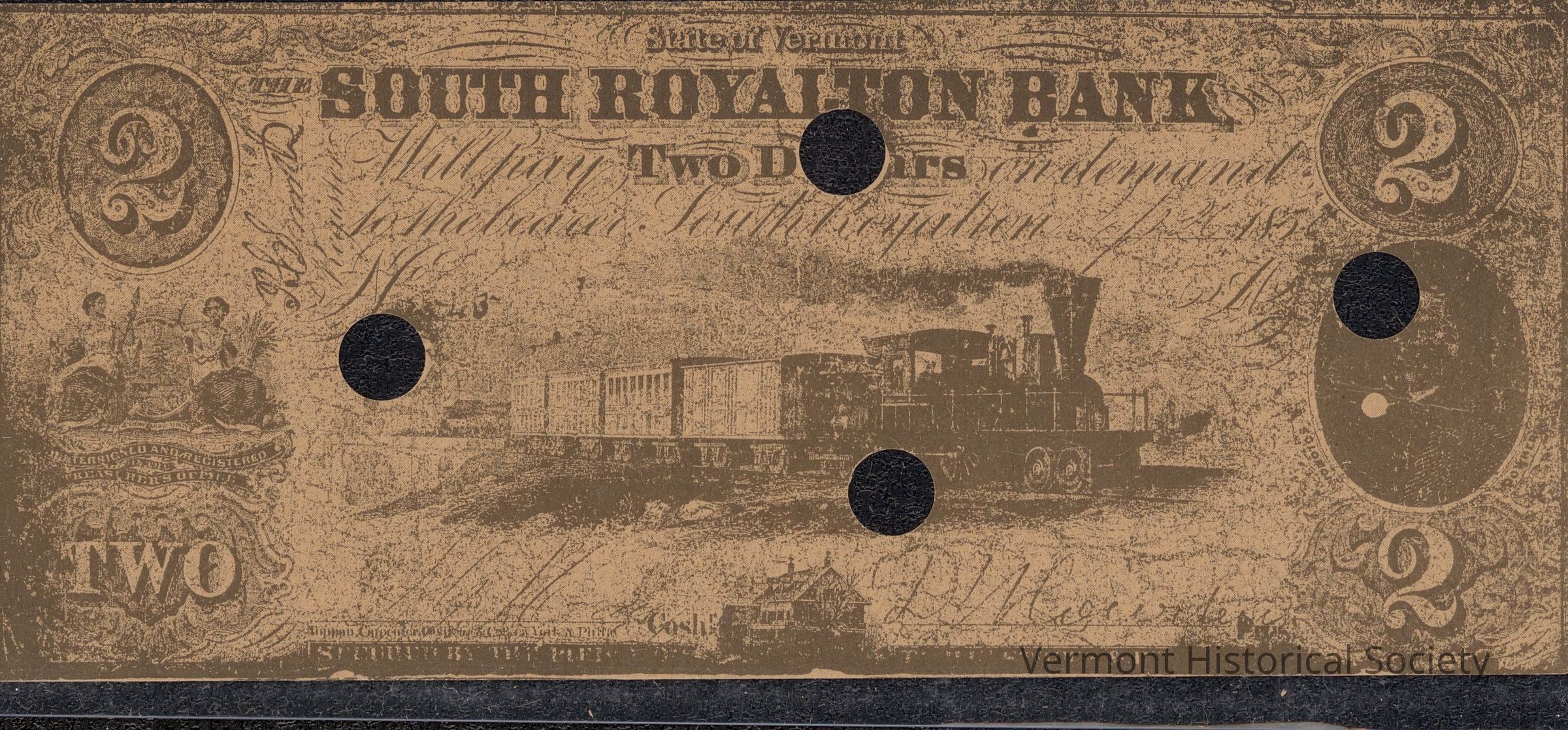 Modern reproduction of a private bank note for 2 dollars from The South Royalton Bank. It has 4 round holes in it.