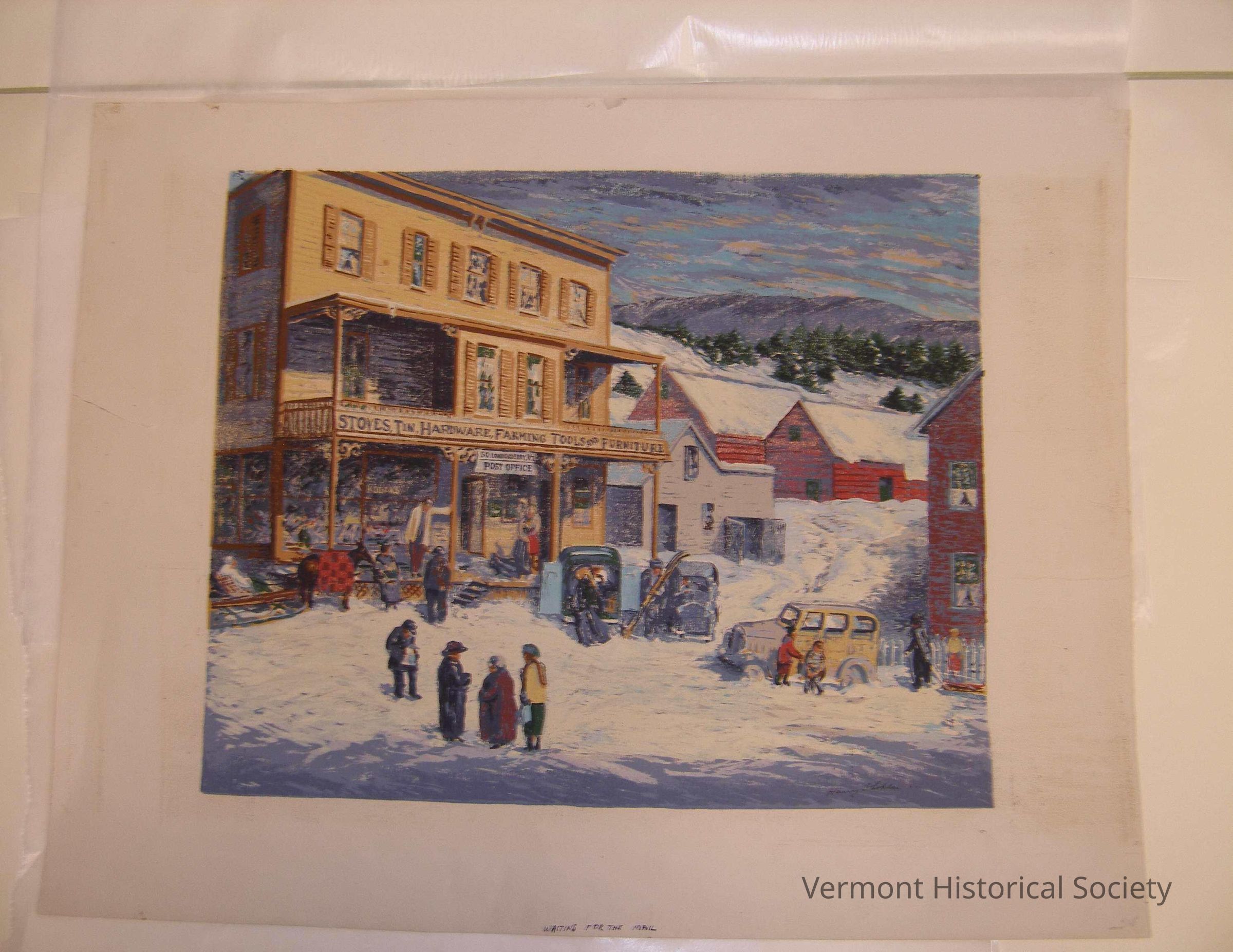 Full-color print showing a snowy town scene of a store with several people outside. The store building has three floors and a covered balcony over the covered porch. There are three cars, a sleigh, and a sled outside. Three people are talking in a group in the road. A man is getting skis out of the back of his car. Surrounding the store building are three red buildings and one grey building.Artwork Details