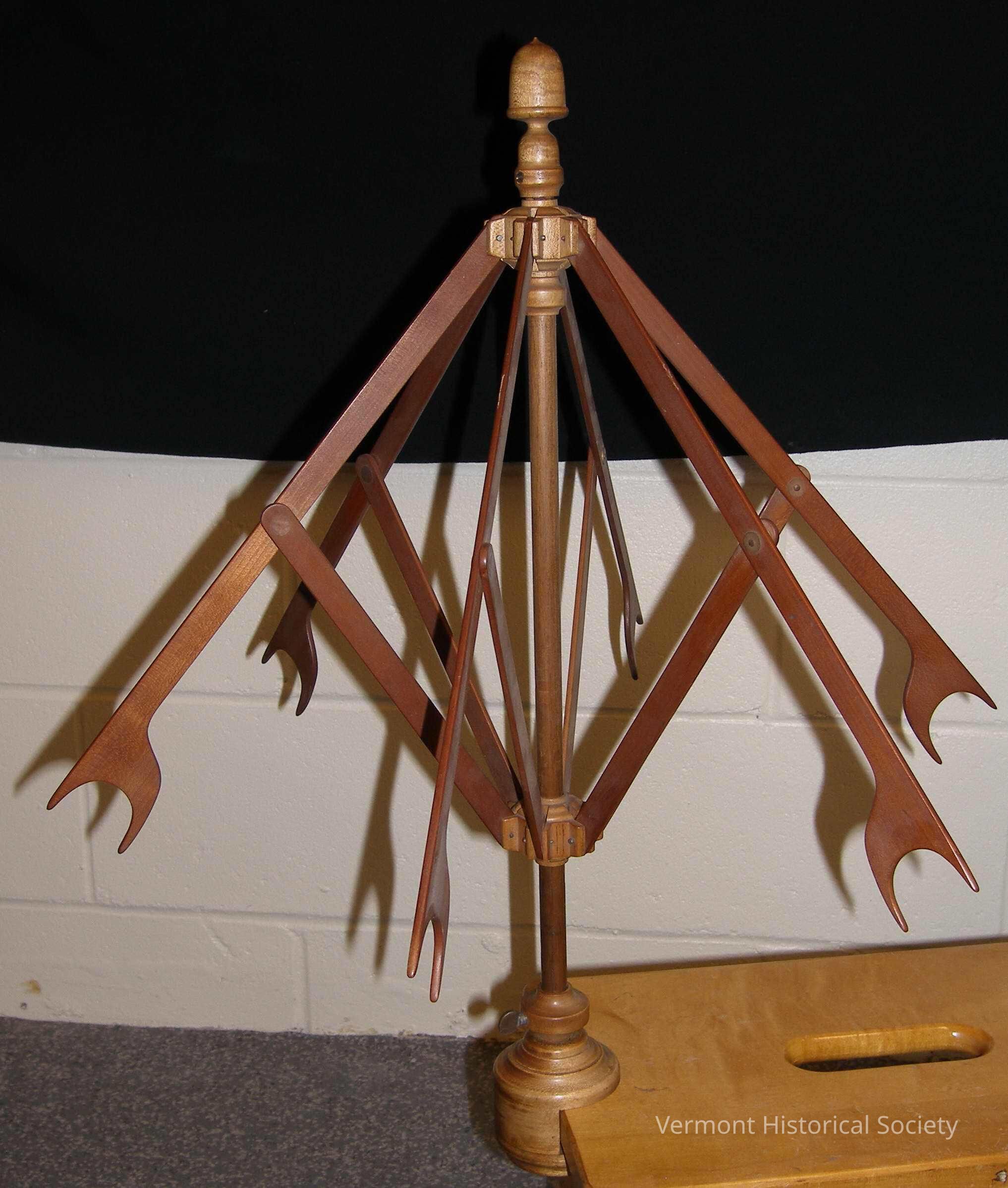 Wooden swift. The swift is primarily made of maple and has six ribs with pin construction to open and close like an umbrella. At the end of each rib there is a cut-away section to hold the yarn while it is being wound. On top there is a carved inverted acorn finial. There is a turned post at the base with a cutout that screws onto a flat surface.