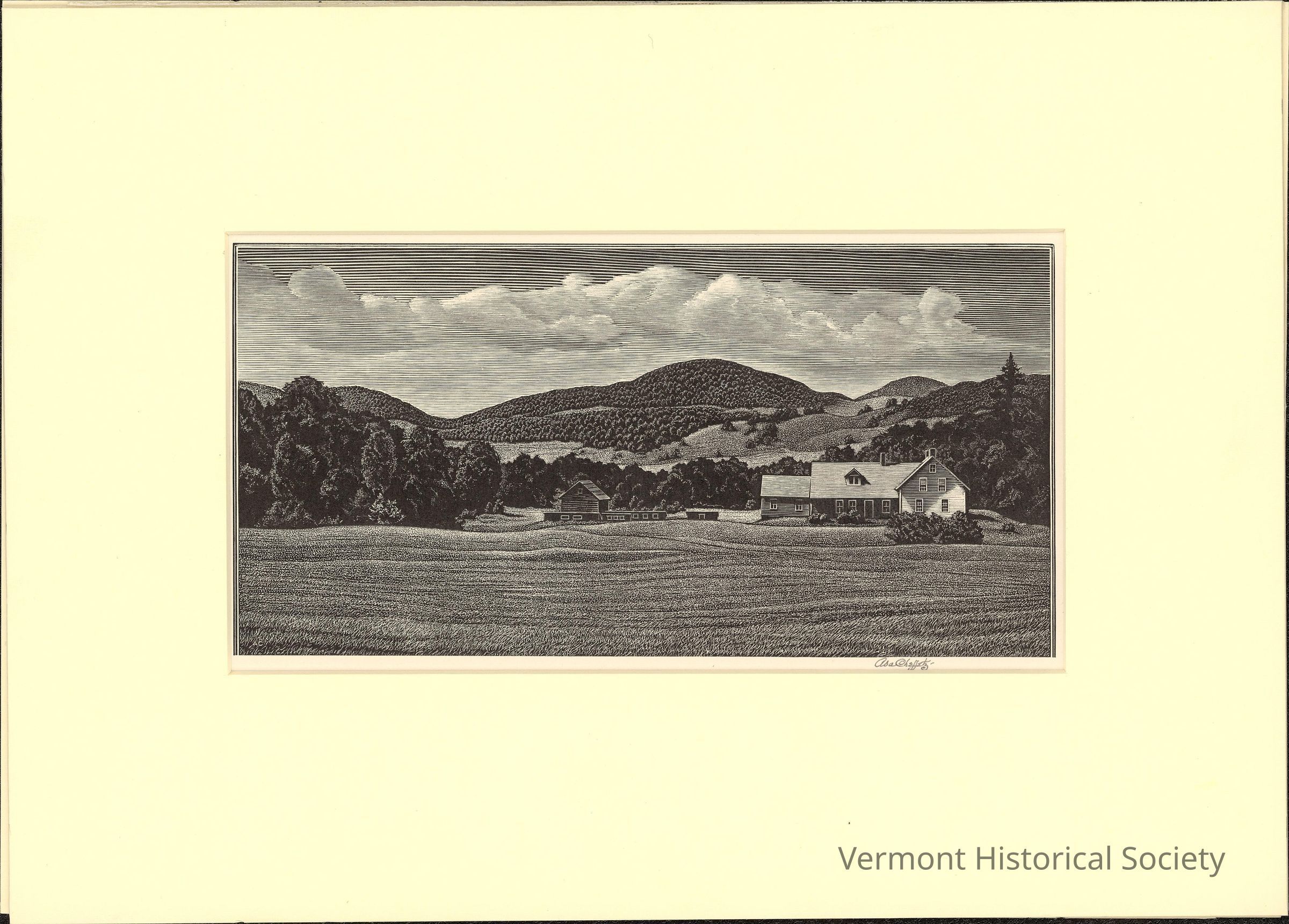 Landscape print showing a house at the far side of a field. The field is planted with grass or a low-lying crop. There are small outbuildings to the left of the house, and a large copse of trees to the left of the outbuildings. The horizon is framed by large, rolling hills. The print is signed "Asa Cheffetz-" in pencil.Acquisition