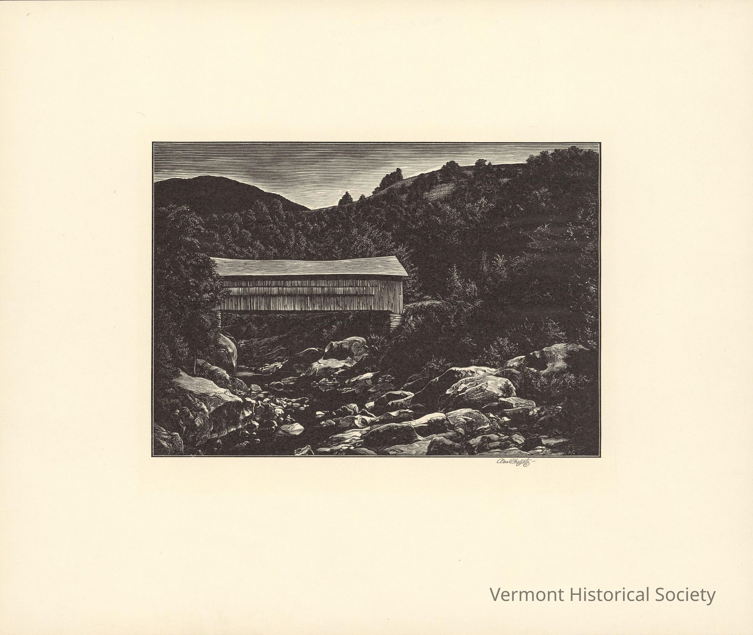 Landscape print showing a covered bridge crossing high above a rocky river. There are trees and shrubs covering the backs, and dark hills and sky in the background.