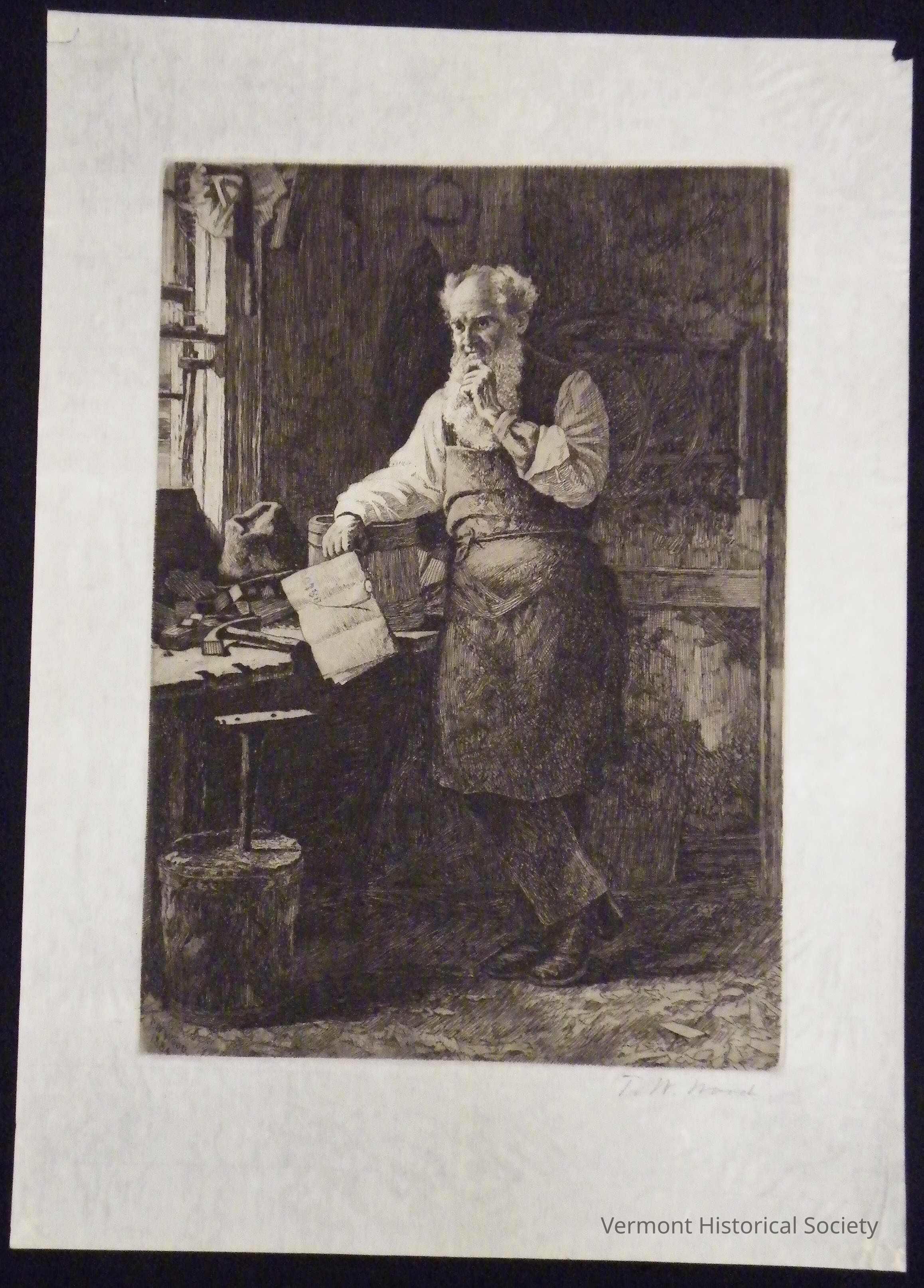 Print showing an elderly man standing in a workshop. The man is bald on the top of his head with fluffy white hair on the sides and a long white beard. He is wearing an apron and leaning on a bucket sitting on a worktable to his right (viewer's left). His left hand is at his chin, and his right hand is holding a newspaper.Artwork Details