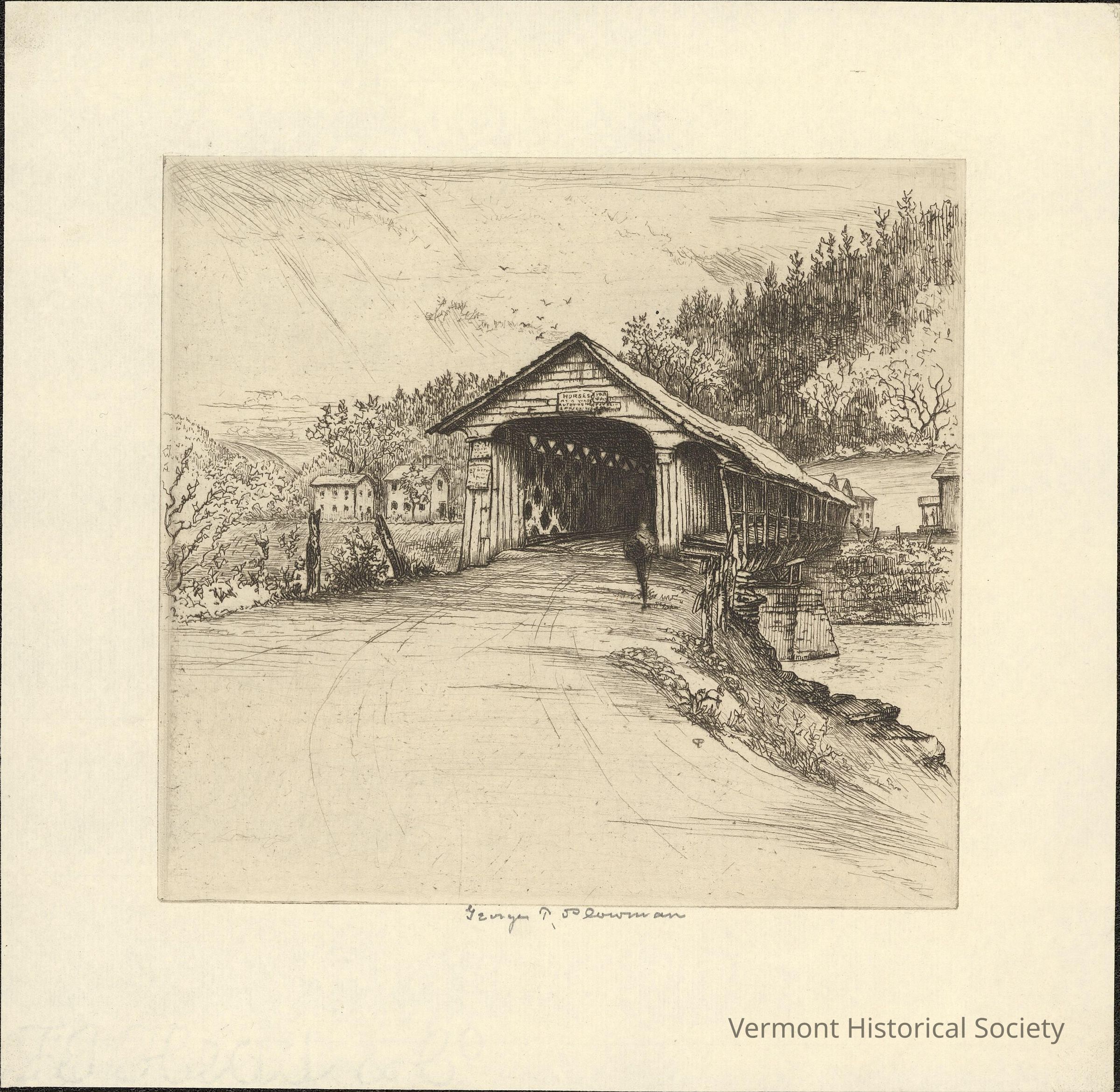 Prints showing a covered bridge crossing a river. The bridge has an extended pedestrian path on the right, and there is a person walking on the side of the road toward the bridge, away from the viewer. There are several signs around the entrance of the bridge: 3 at the top, 2 on the left, and 1 on the right. There are residential buildings visible on the far side of the river, and a tall hill rises in the right background.Artwork Details