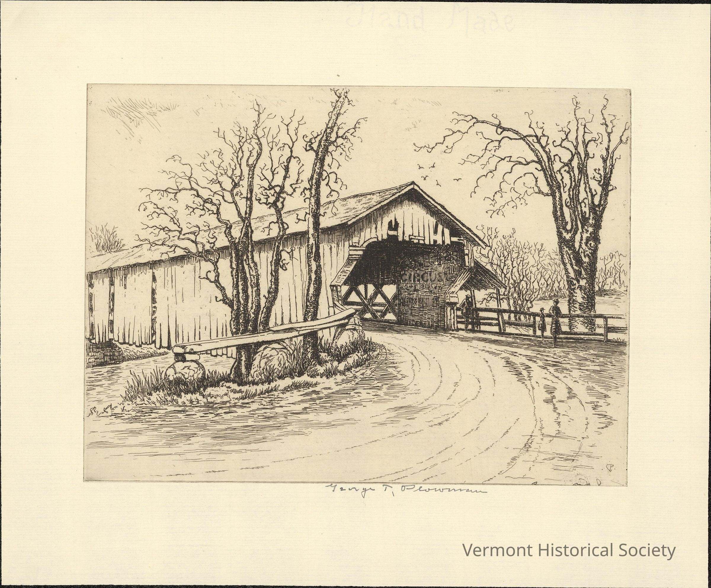 Print showing a covered bridge crossing a river. The bridge is oriented to the right, slightly toward the viewer, with the far side out of frame. It is shown as dilapidated, with multiple boards missing and several chips around the top of the entrance. A woman and young girl are standing by a fence near the entrance of the bridge's pedestrian path, and a man is exiting the path. The darkly shaded interior of the bridge has the work "CIRCUS" barely visible on the wall. There are dead trees flanking the bridge and on the far bank of the river.Artwork Details