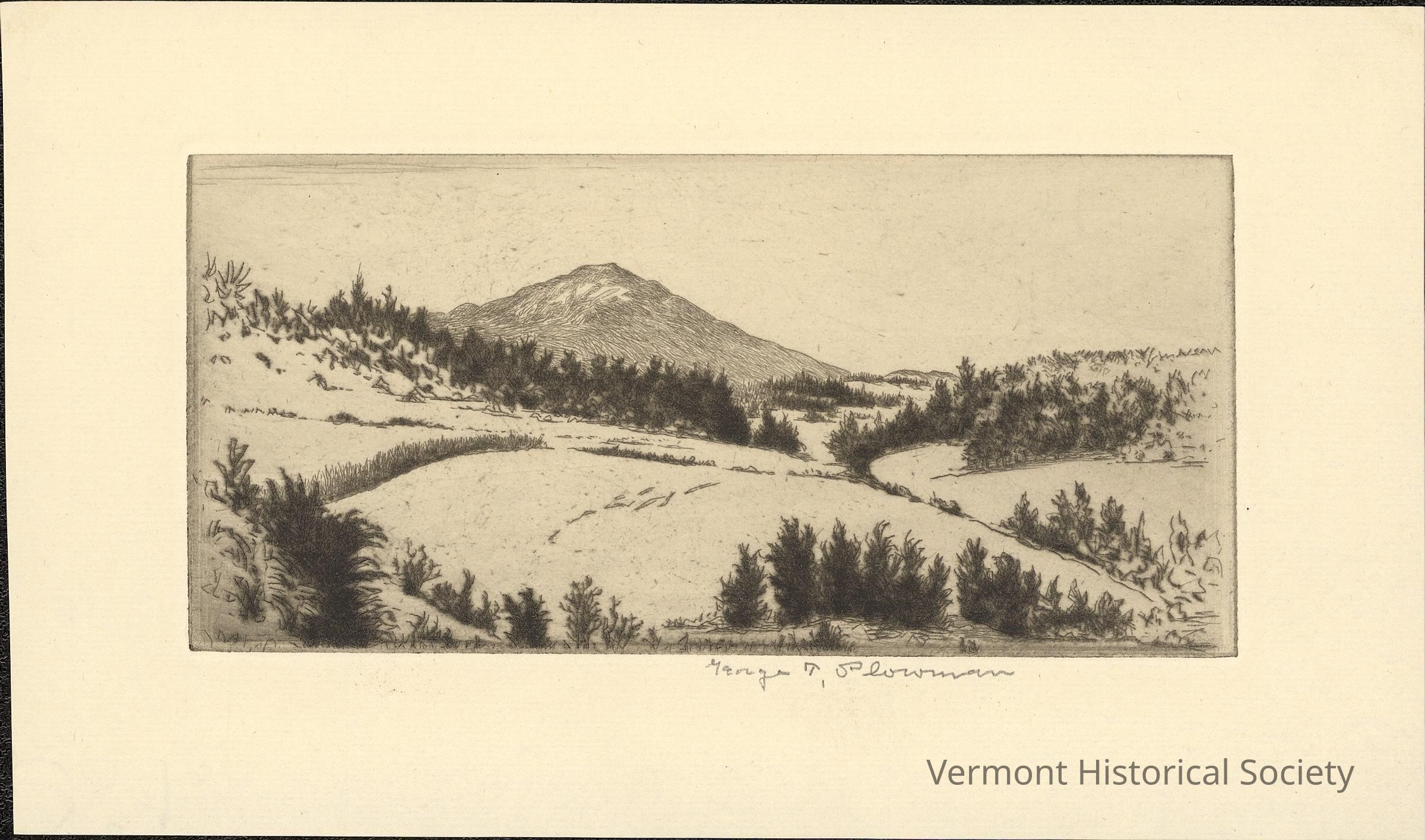 Landscape print showing rolling hills with a single, tall mountain in the background. The hills are sparsely covered with trees or shrubs. The print is signed "George T. Plowman" in pencil beneath the image.Acquisition