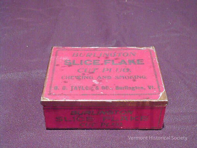 Wooden box covered with red paper. The lid is printed with the label, "BURLINGTON SLICE FLAK CUT PLUG. CHEWING AND SMOKING. A. B. TAYLOR & CO. Burlington, Vt." The sides are printed with the label, "BURLINGTON SLICE FLAKE CUT PLUG."Context