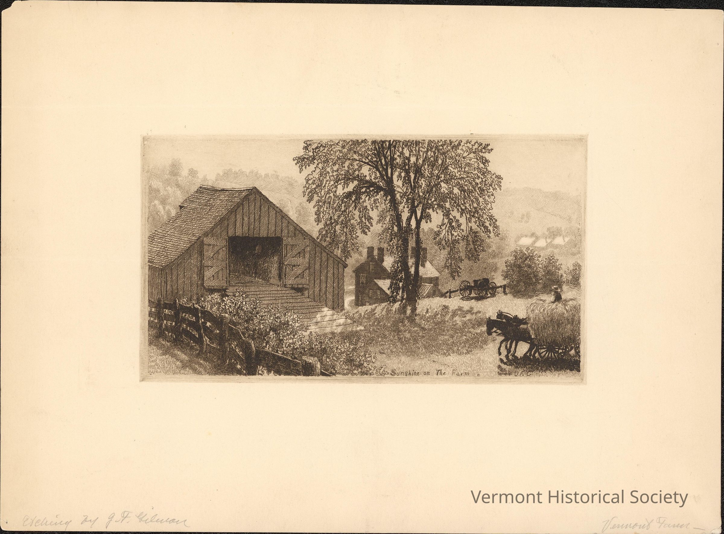 Print showing a farmyard. There is a large barn on the left set into a hill. There is a large door on the second floor open toward the viewer, with a ramp leading to the ground of the hill behind the barn. At the bottom right, a man sits in a hay-filled cart pulled by two donkeys moving toward the barn. There is a large house with four chimneys and two additions at the center in the middle ground, and a chaise cart behind the house on the edge of the hill. There are three houses in the far distance at the center right edge of the composition. The bottom is inscribed with the title, "Sunshine of the Farm", and signed "J. F. Gilman '88".