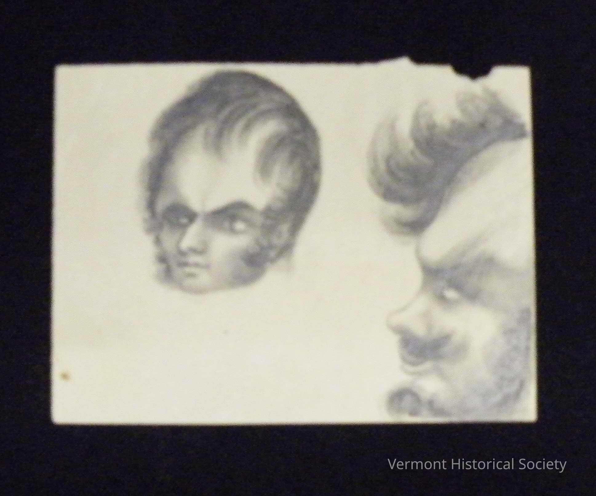 Sketch showing two male heads. The sketch is on a small, rectangular piece of paper. One head is showing at a 3/4 angle. It has an exaggerated, large forehead with hair brushed to the front and long sideburns. The other head is drawn in profile along the right edge of the paper. It has a beard, mustache, and tall hair along the ridge of the head. There is a portion of what appears to be a sermon hand written on the back of the paper.Acquisition