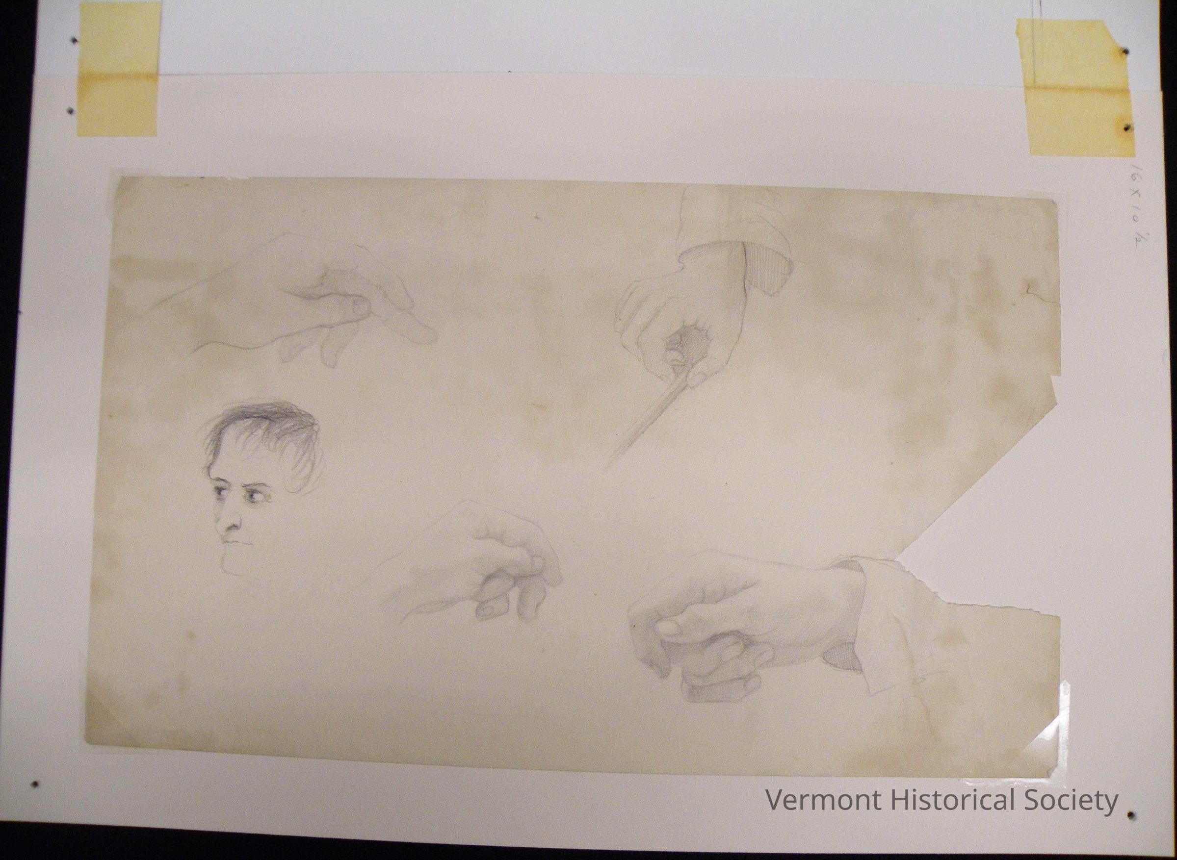 Small, rectangular piece of paper on which are 4 detailed studies of hands, fully shaded, and 1 study of a face.Acquisition
