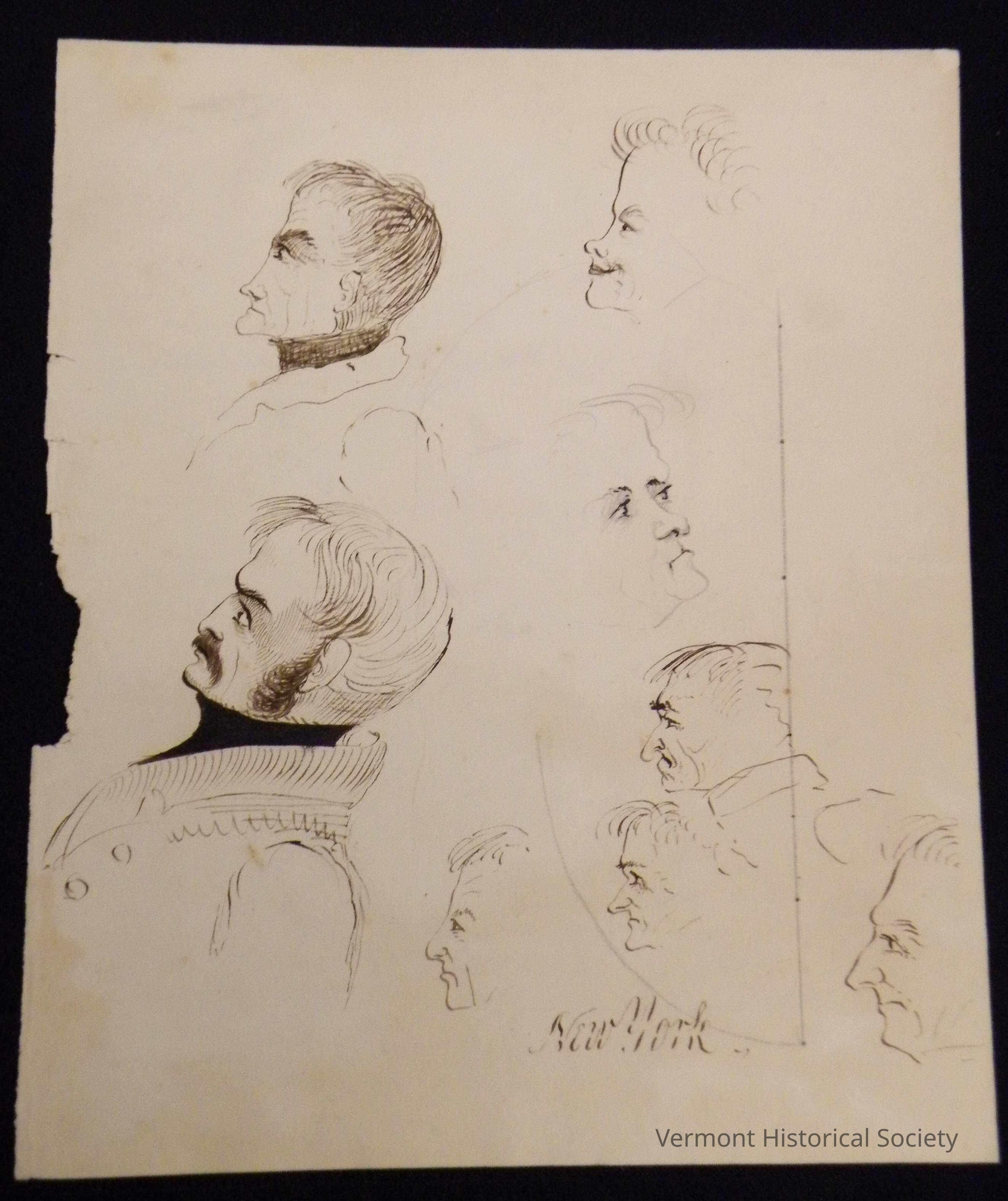 Rectangular piece of paper containing 2 bust portrait studies and 6 facial profile studies.Acquisition