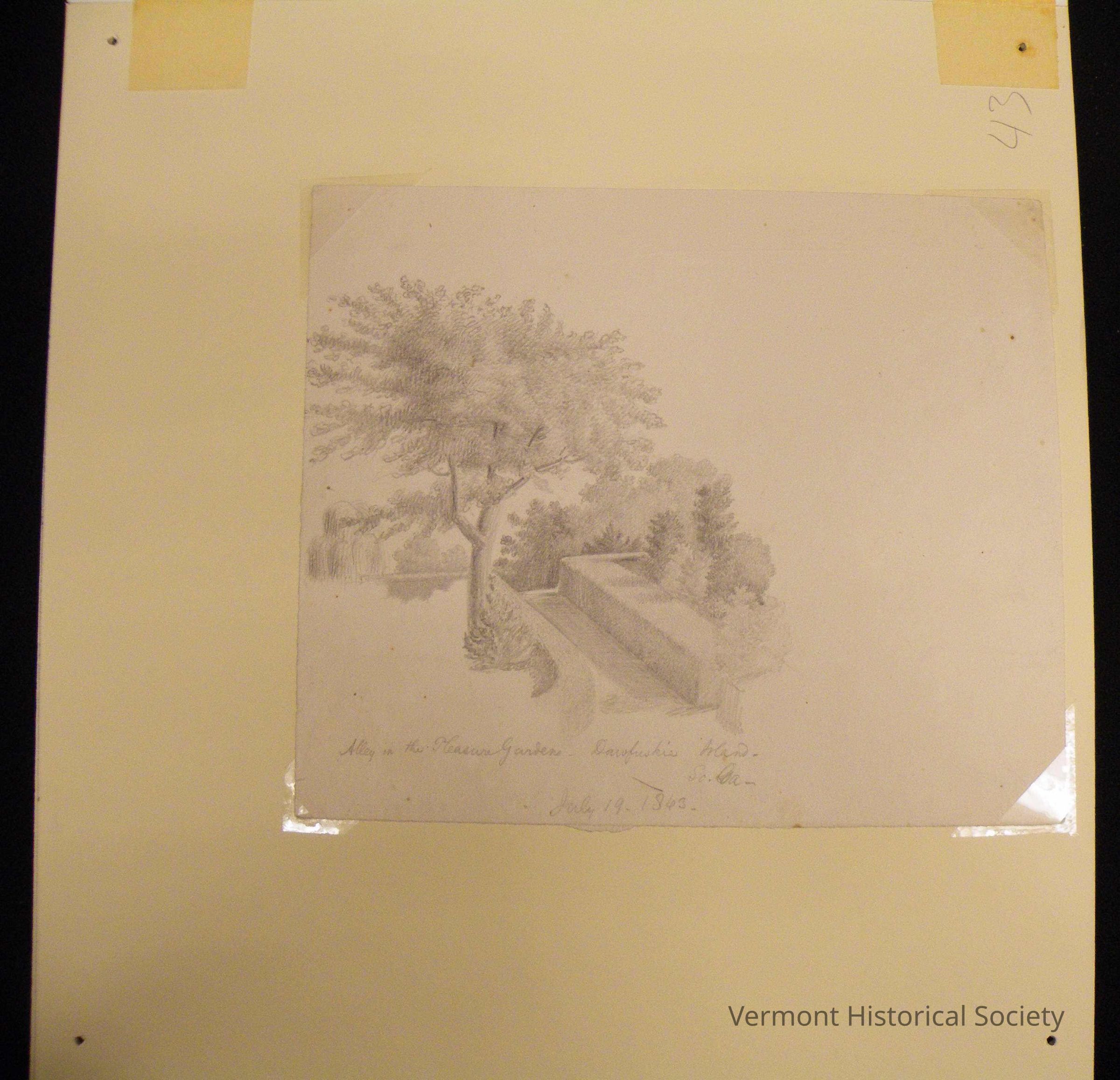 The sketch portrays a landscape scene with various elements. On the left side, there is a tree positioned next to a pathway. On both sides of the pathway, there are neatly cut and trimmed box hedges. Moving towards the right side of the sketch, there are small trees and shrubs situated next to the hedge. In the background, there are additional trees, shrubs, and what appears to be a weeping willow tree towards the left.Acquisition