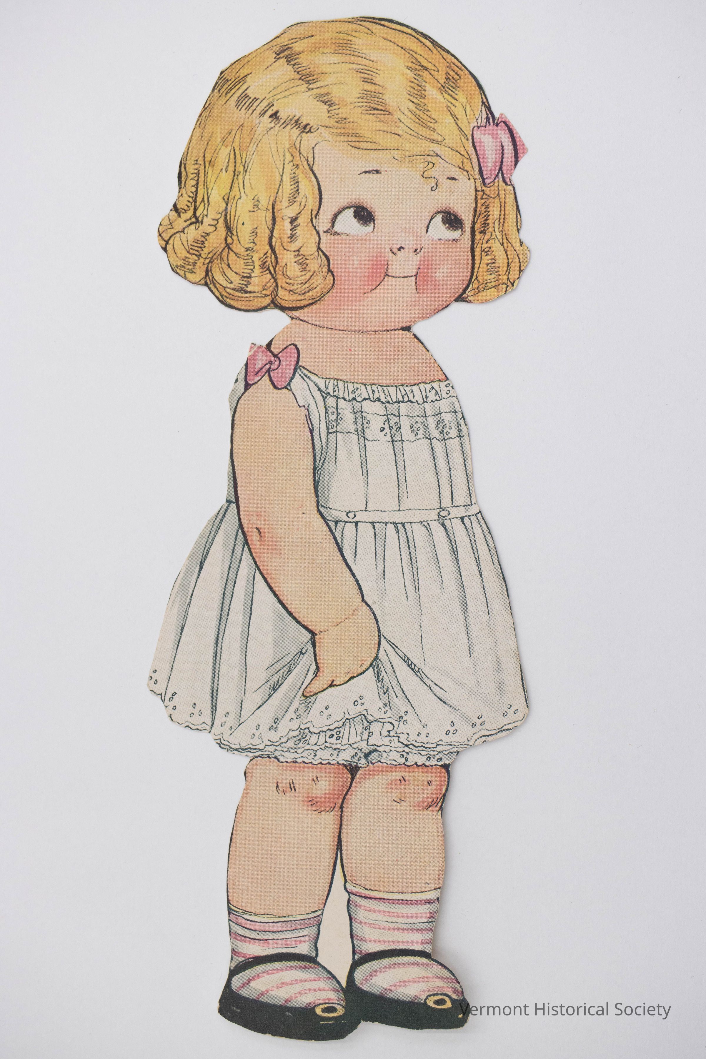 Small paper doll. The doll depicts a young child with yellow hair and pink skin wearing a white dress undergarment, pink-and-white socks, and black shoes. The back shows a portion of a magazine page and the handwritten label, "Ella Stickney".Context