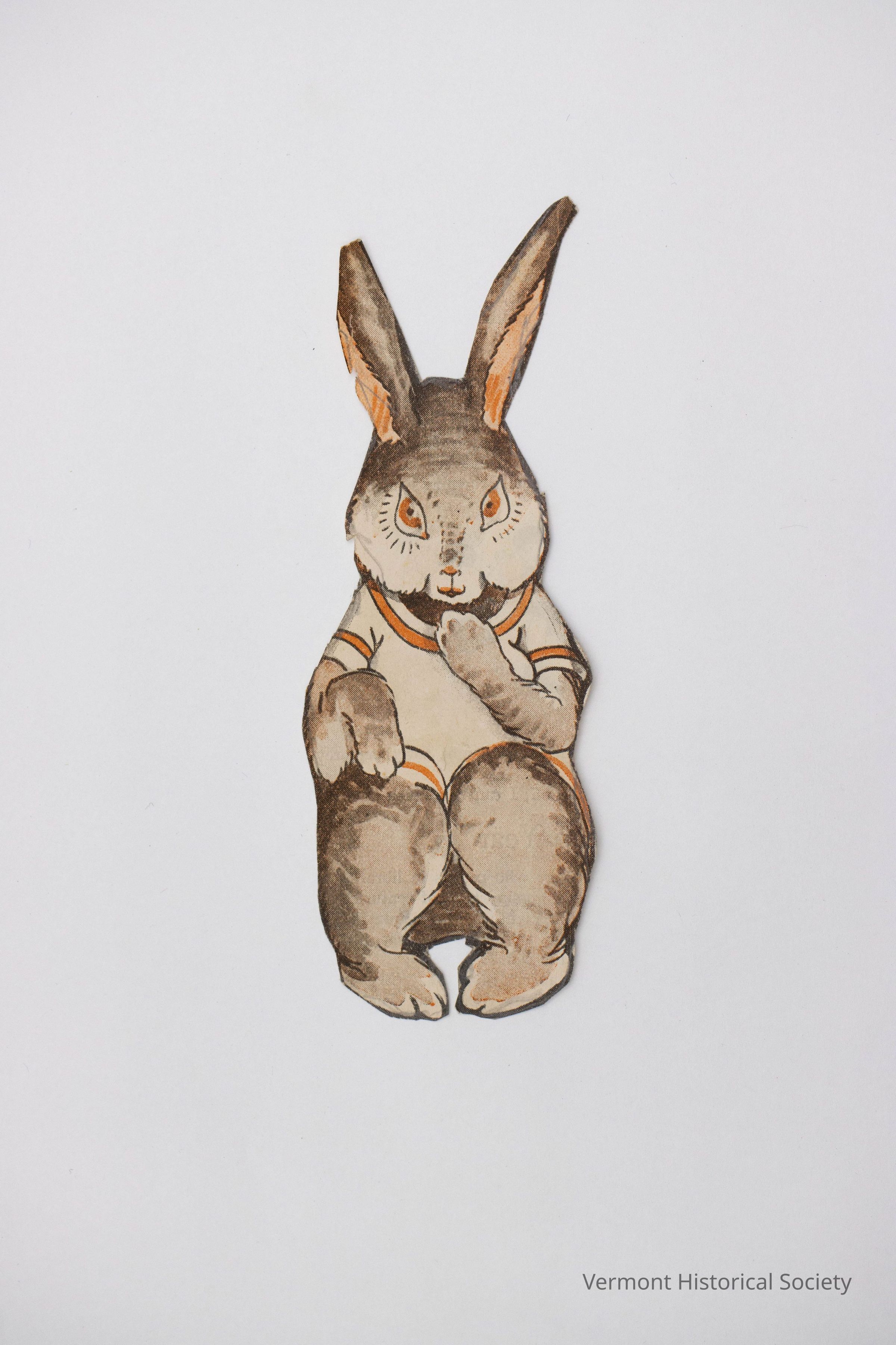Printed paper doll showing a grey rabbit wearing a white shirt. The back shows a portion of a page of a magazine.Context