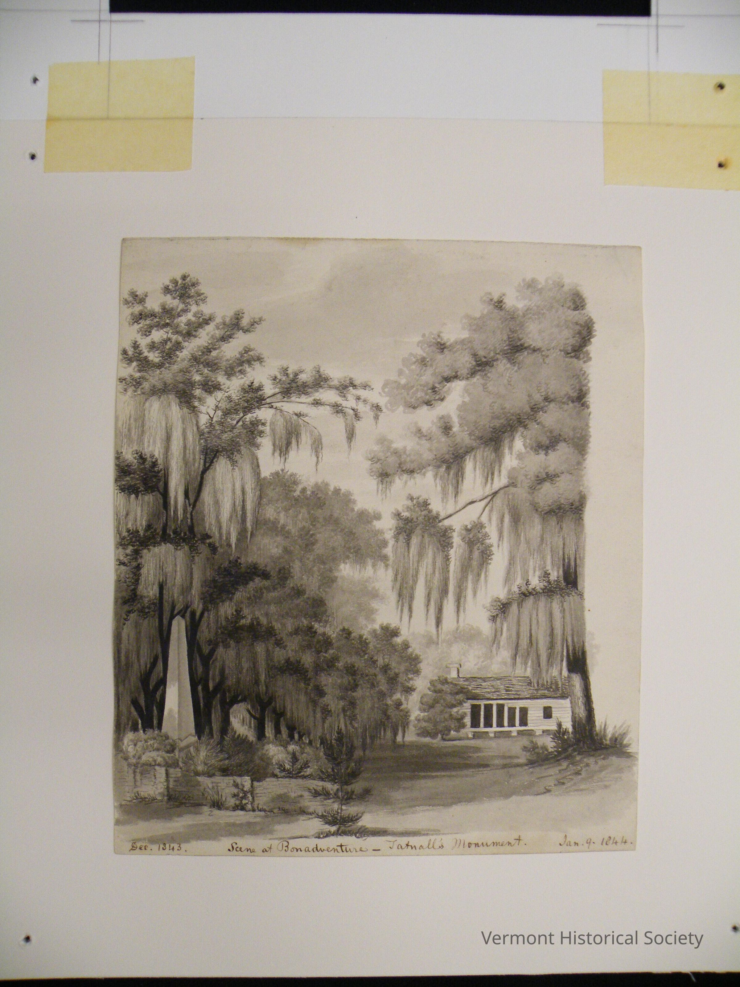 The landscape sketch presents a scene featuring several distinct elements. In the lower left portion, there is a monument that is surrounded by bushes and a stone wall. Towards the right side and in the middle ground, there is a house that can be seen in the background. On the left and right edges of the sketch, there are trees that frame the scene. These trees appear to be covered with Spanish moss.Acquisition