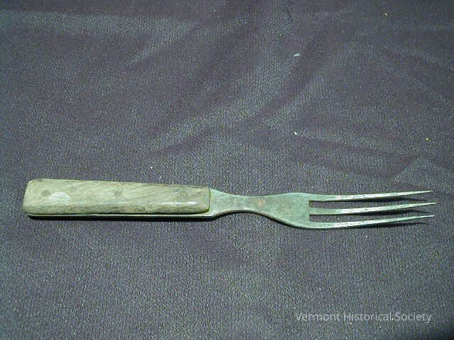 Three-tined fork with a steel shank and tines and a wooden handle with two rivets.