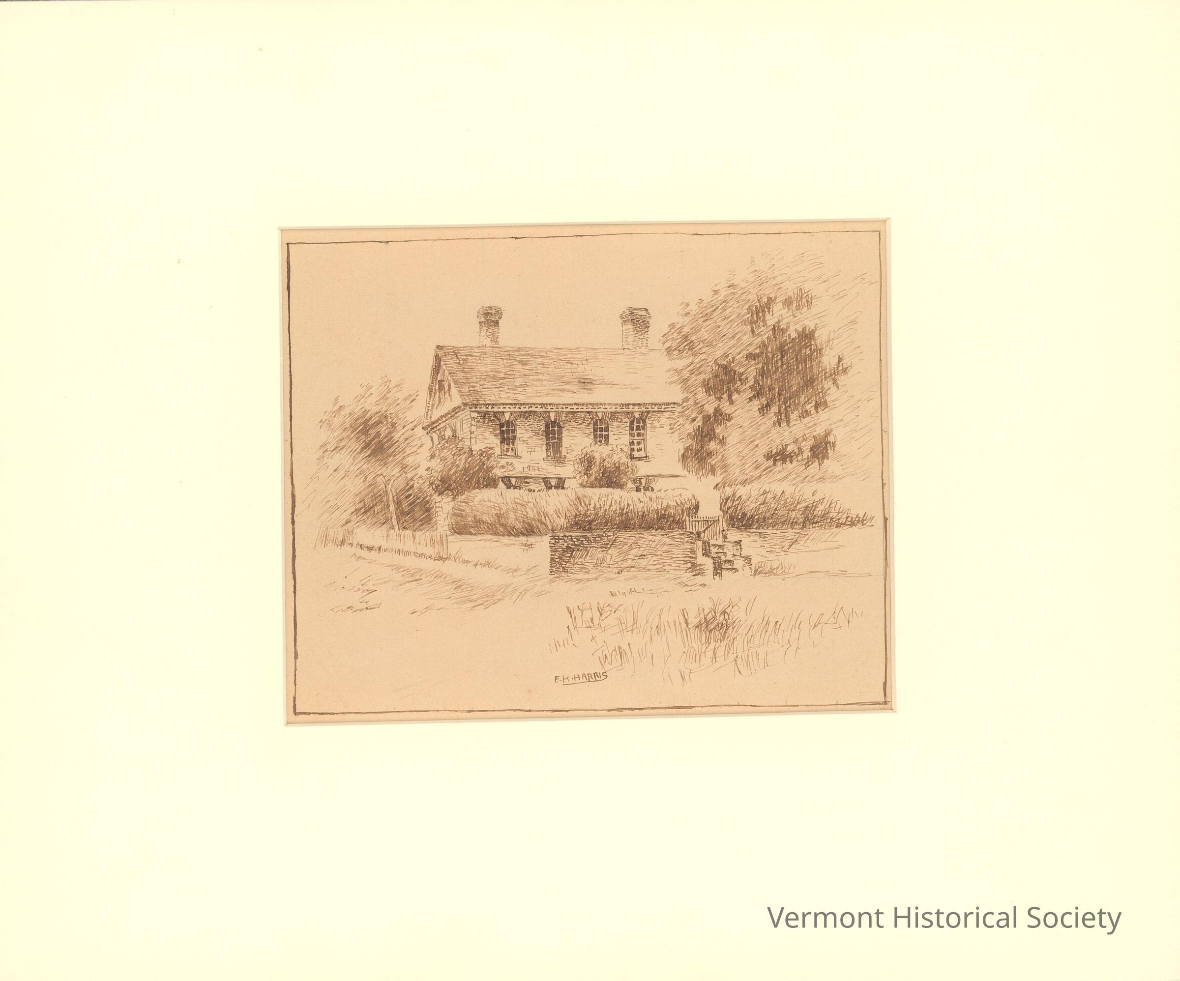 Pen and ink drawing showing a stone or brick building viewed from the side. The building has arched windows and 2 chimneys. It is set behind a row of low hedges set atop a low wall with steps leading up to a small gate at the center. The bottom is signed, "E. H. HARRIS".Type of Drawing