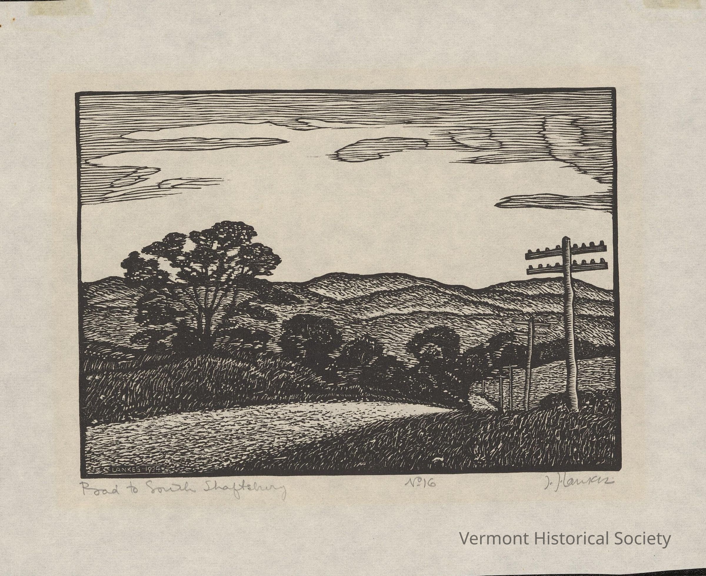Print showing a road through rolling hills with low mountains in the background. Trees line the left of the road and power poles line the right of the road.