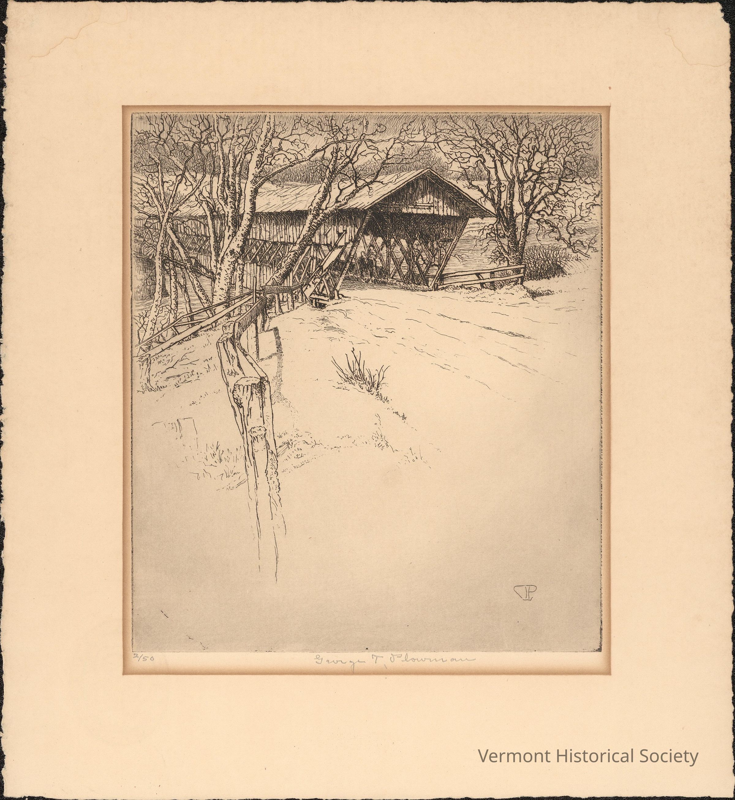 Print showing a covered bridge as seen from the road. There is fencing on both sides of the bridge, and the entrance is flanked with leafless trees. There are two figures walking in the bridge.