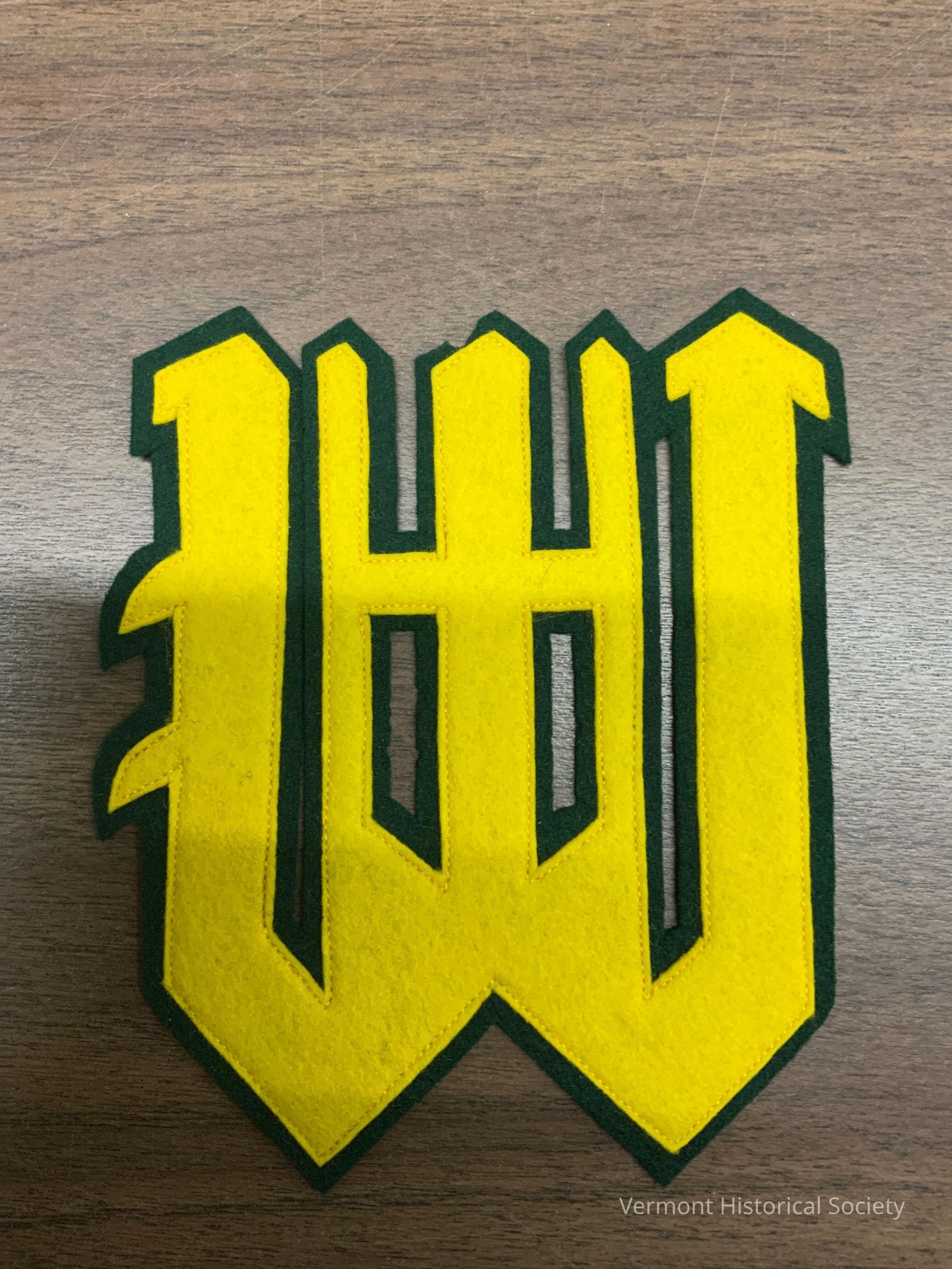 Yellow felt W in gothic script over a green felt ground. The W is formed with three lines in the center connected by a horizontal stripe, and it has two decorative swashes on the left side.