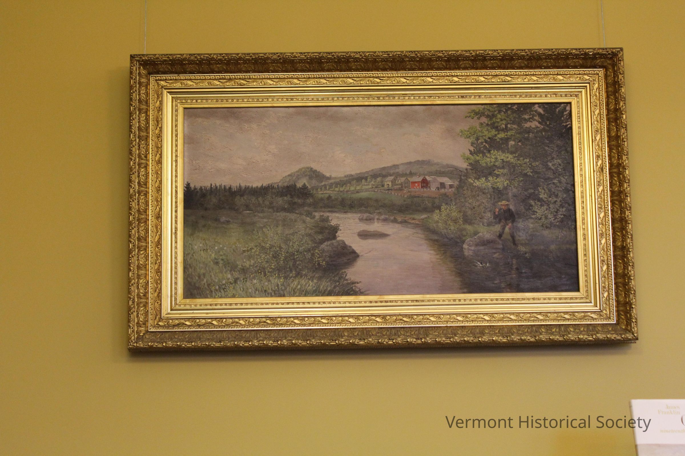 Landscape showing a stream at the center flowing through a valley. At the right foreground there is a young boy in a straw hat pulling a fish out of the stream. Behind him in the distance is a farm complex consisting of two large, yellow houses, a red barn, and several white outbuildings. There are hills and mountains in the background and a stand of pine trees to the left of the farm.Type of Painting