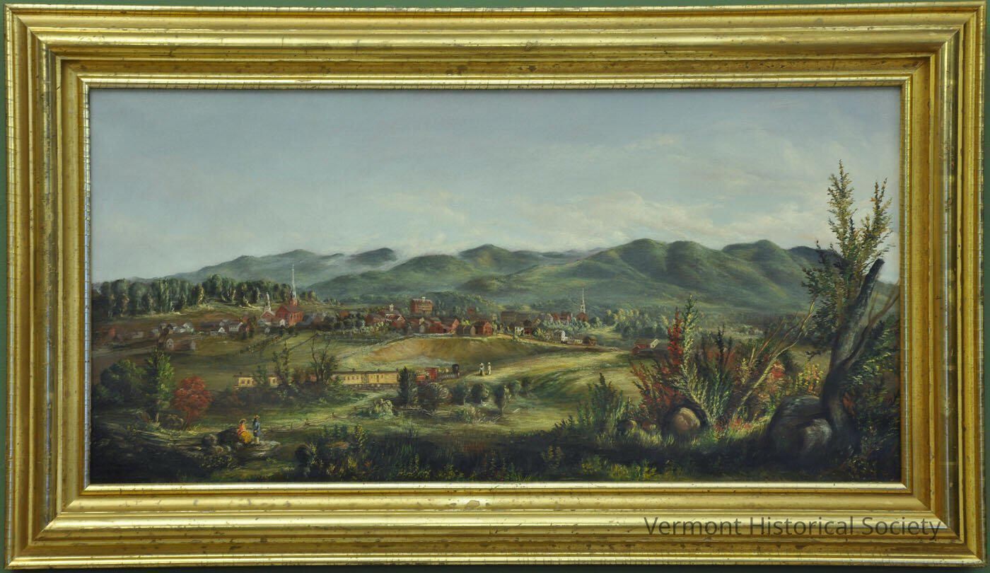 Landscape scene showing a town set among green hills with a train running through the middle ground. The town has several churches with tall, white steeples. There is a pair of people at the bottom left corner and another at the center.Type of Painting