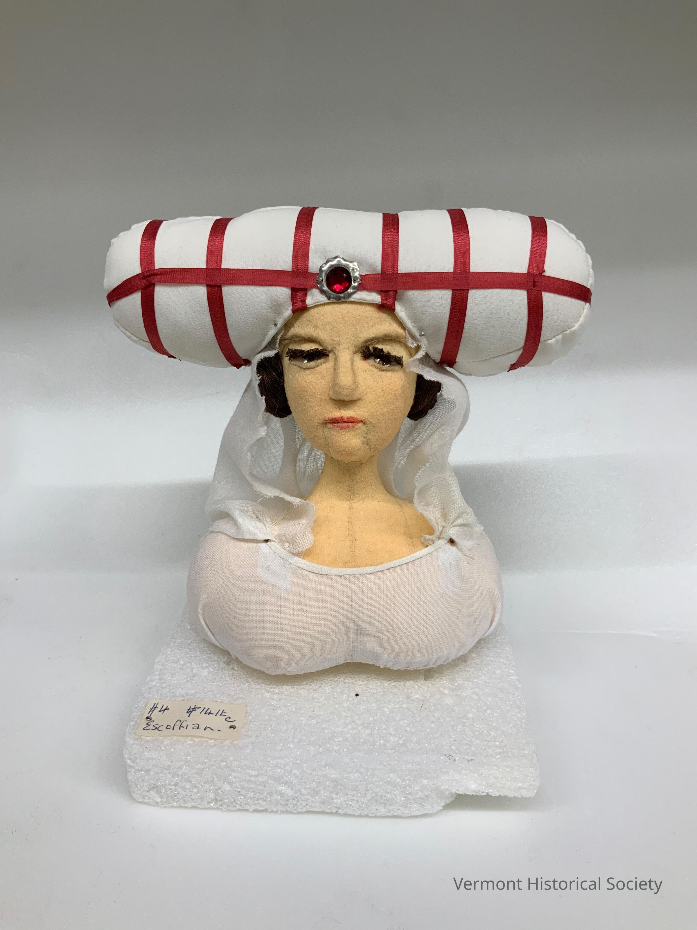 The bust is inserted into a Styrofoam base with two metal wires. The base has a paper label that reads, “#4 14thc Escoffian."Use