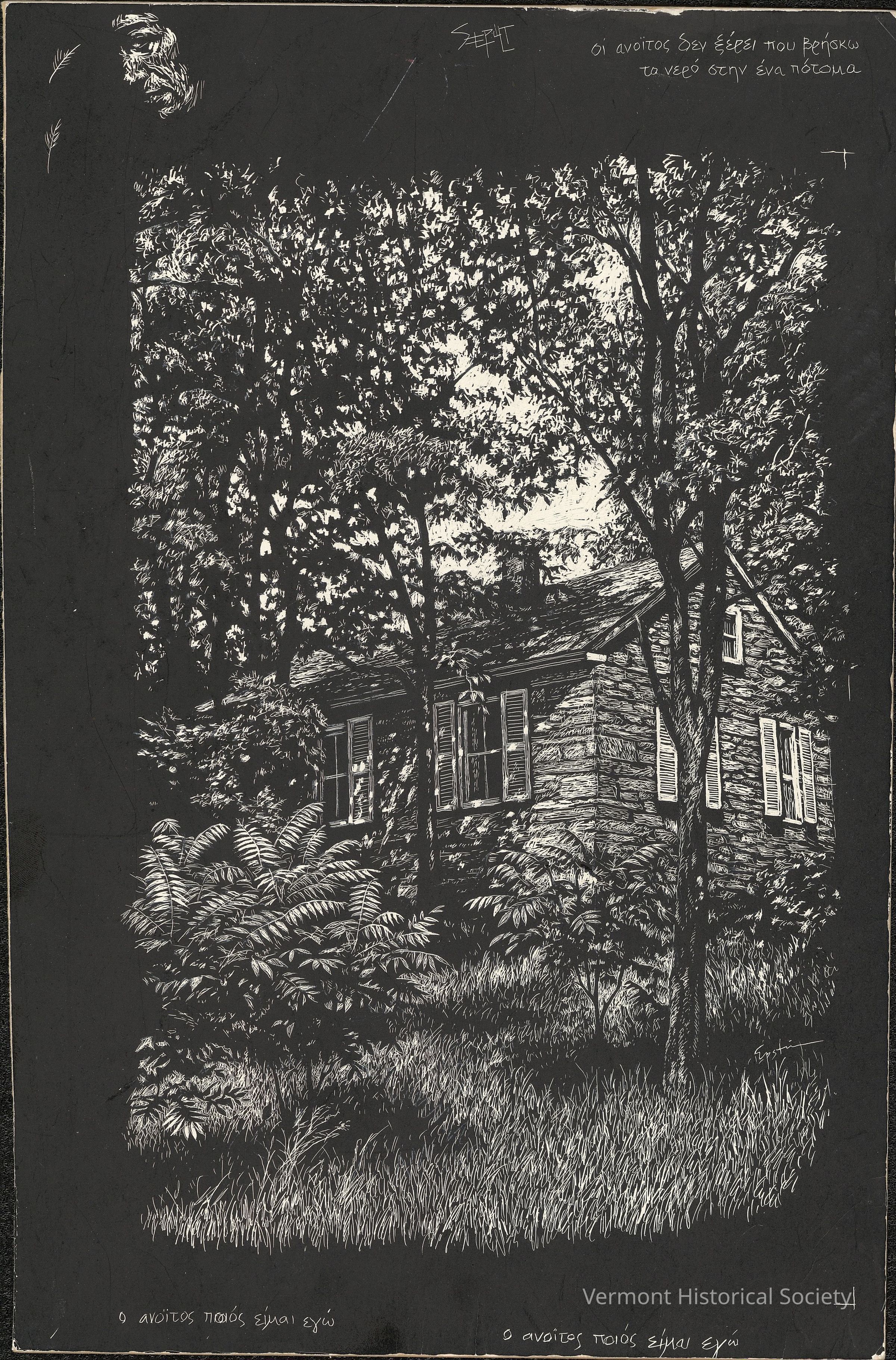 Scratchboard illustration showing a stone house closely surrounded by trees. There are 4 first-floor windows visible, each flanked by shutters, and 1 small window on the second floor. There is a chimney at the center of the roof's peak. The house is surrounded by tall, skinny trees and leafy, fern-like shrubs. There are Greek words at the top right corner and along the bottom.Context