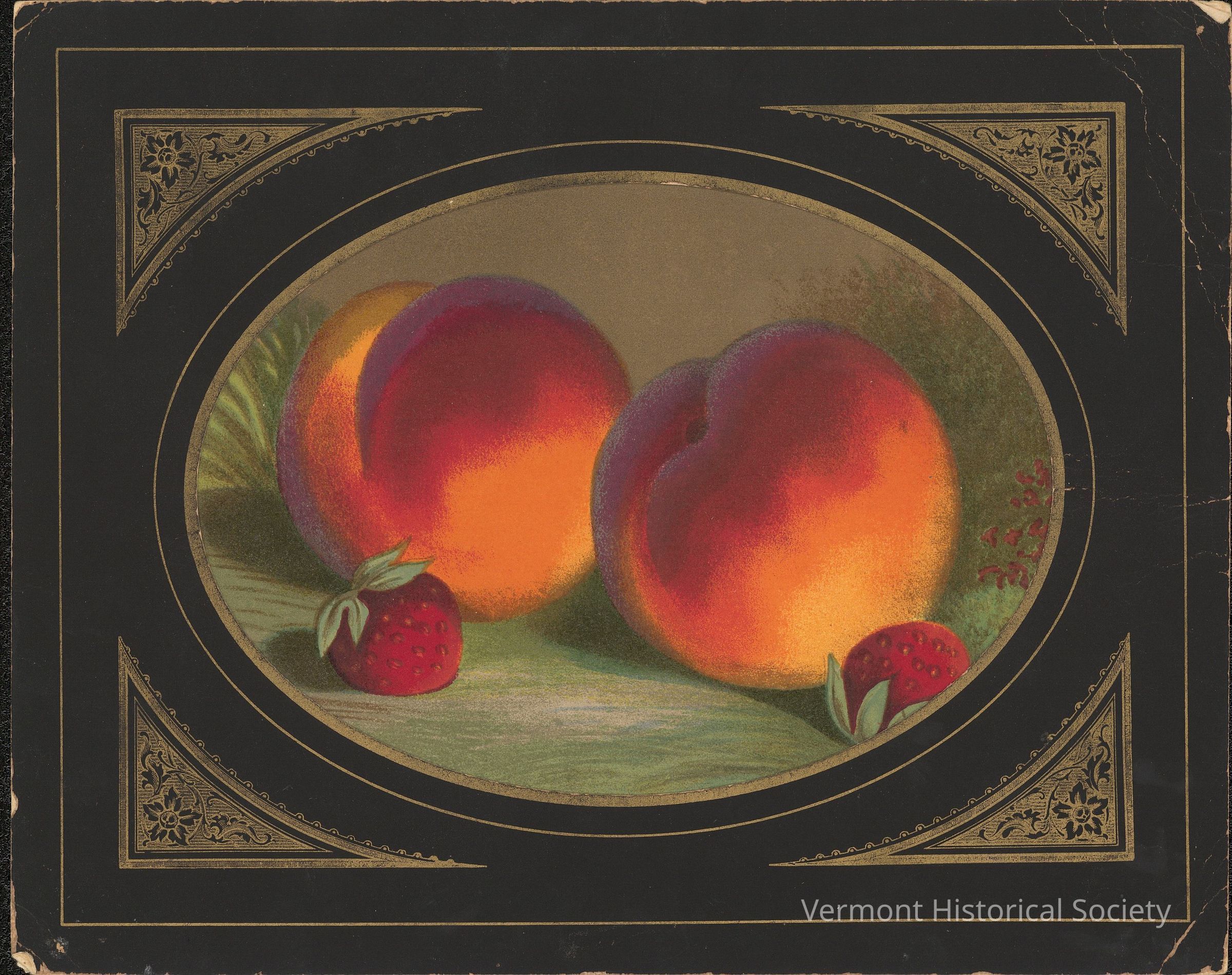 Full-color print showing two large peaches with two strawberries. The print is matted under a rectangular mat with an oval opening. The space between the opening and the edge is decorated with gold. The back has the penciled inscription, "Eric St. John. from your teacher, Nancie S. Flag".
