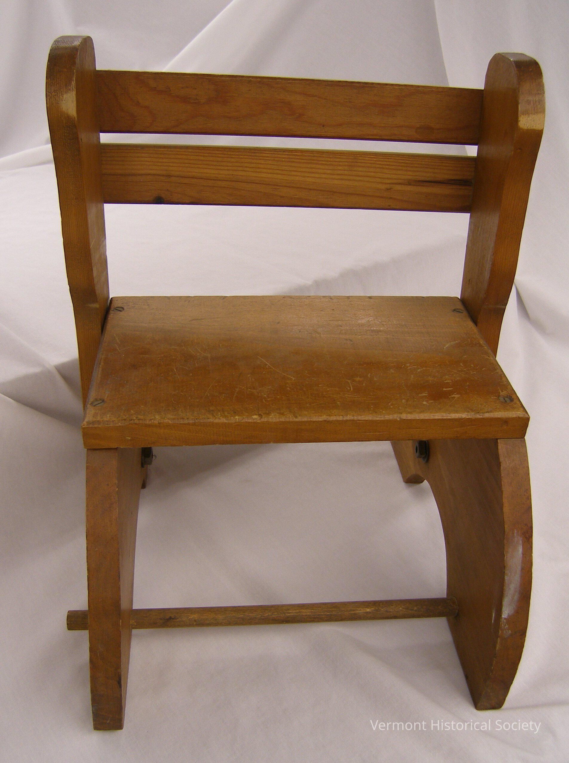 A child's step stool/chair combination. The back of the chair swings down to create a step. A paper label on the back reads, "J's Craft Shop Hardwick".