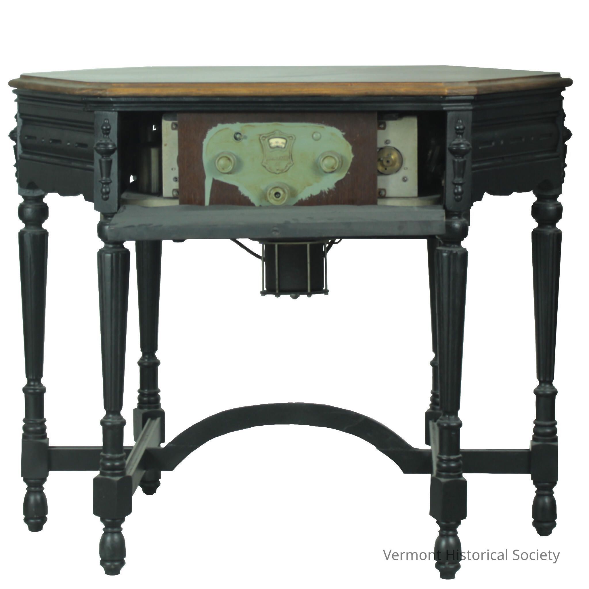 Many Kent radios were built into furniture pieces, and this table is an example of a particularly elaborate one. It was made by the Kiel Company of Milwaukee, and originally cost $175 when it came on the market in 1929. The company offered installment plans, which made even this high-end piece of technology accessible to the average American. At the time, radios would have occupied the central place in a home that televisions hold today – as a focal point of a room, a primary source of entertainment, and a connection to the outside world.