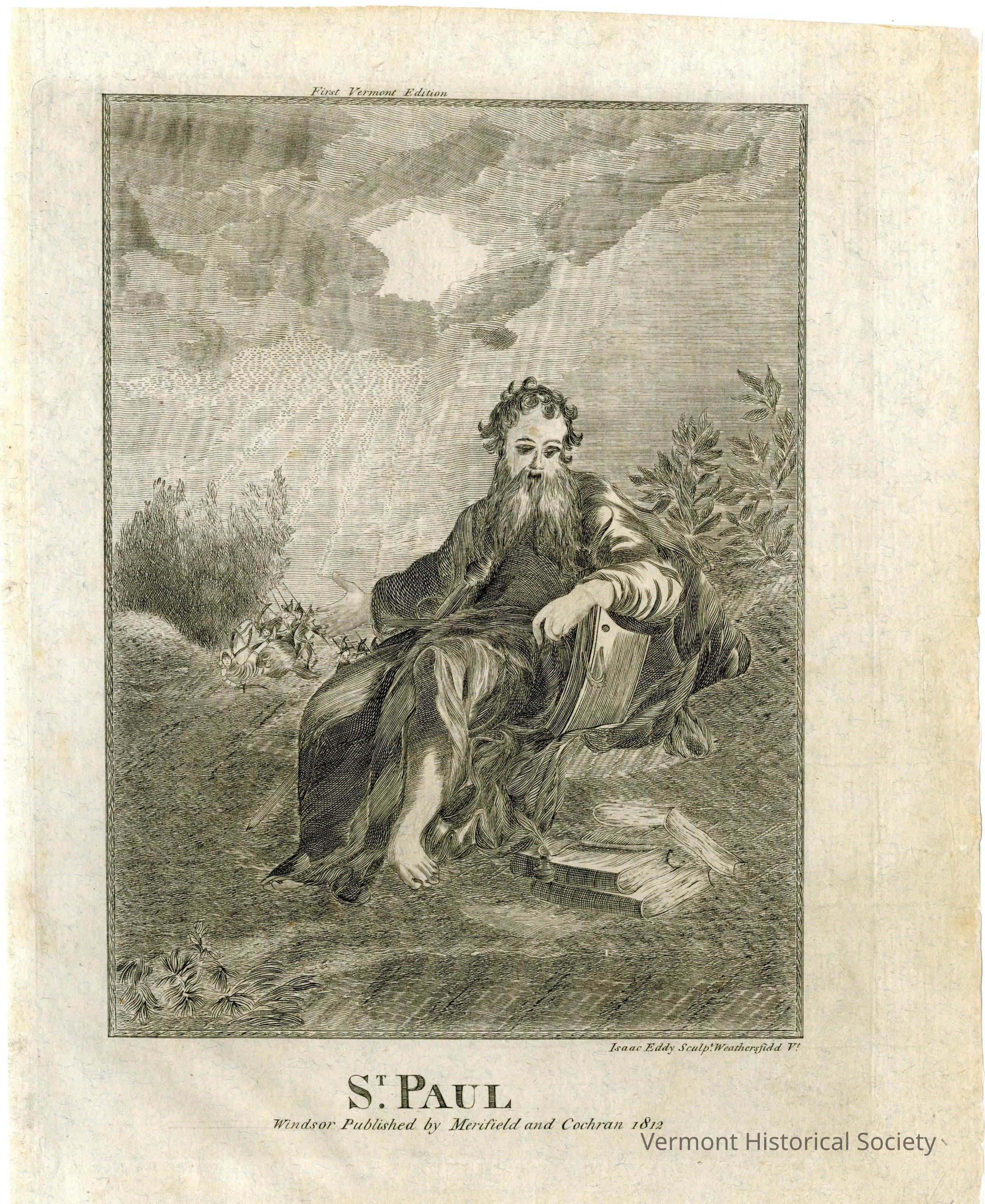 Engraved print showing a man with a long beard seated on the ground outside. His is leaning on a large book, and there is a stack of books on the ground beside him. His has a sword at his right side and is indicating behind him to a group of soldiers, one of home is in the process of falling off his horse.