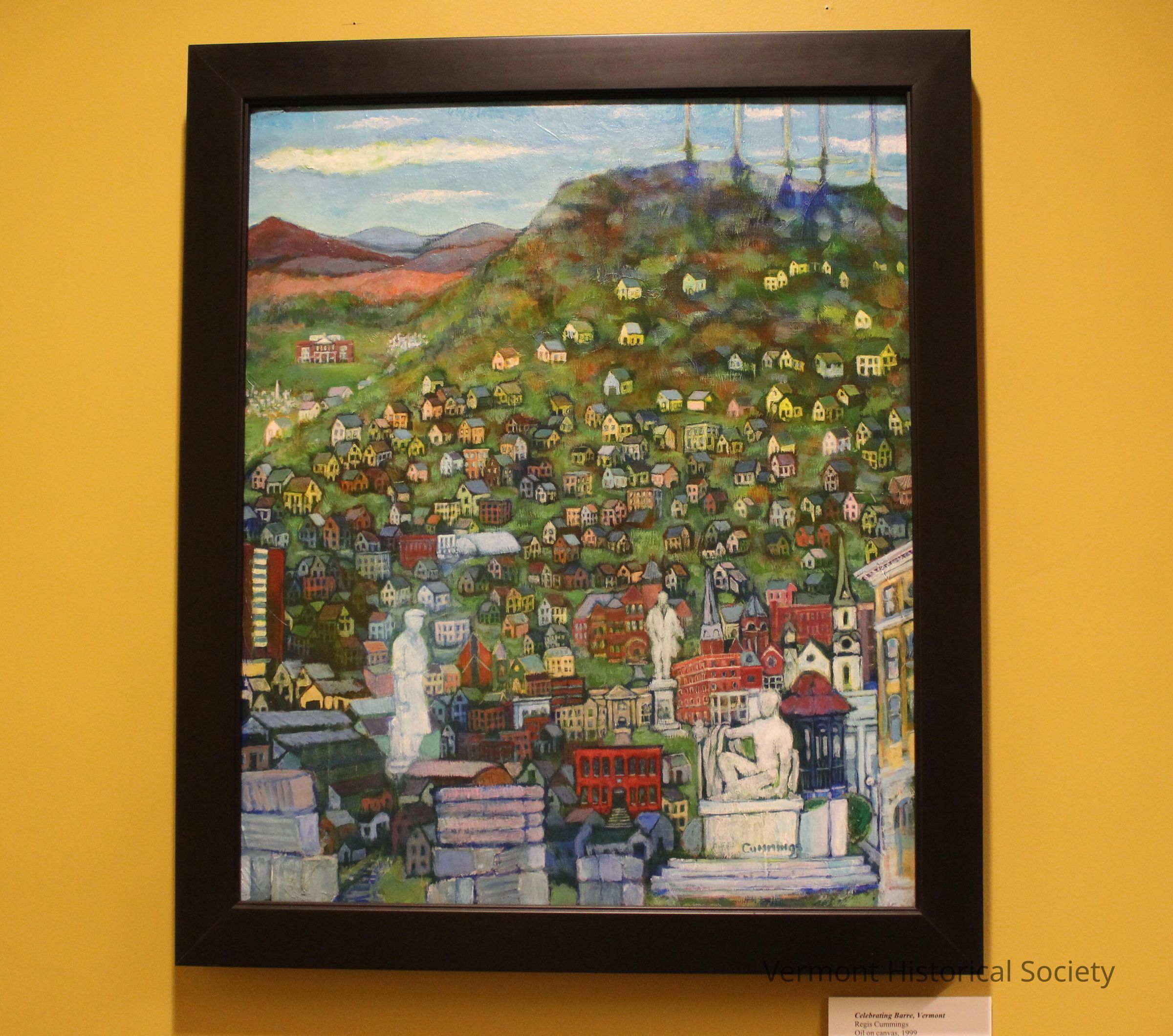 Semi-abstract view of a city (Barre, Vermont) set in a valley and spreading up a mountain. The view shows several local landmarks, including recognizable buildings, with monuments shown at a much larger scale. Local features include the downtown bandstand, blocks of waste granite, Youth Triumphant, the labor hall, Robert Burns monument, Italian Granite Workers memorial, Spaulding School, First Church Universalist-Unitarian, and Barre Opera House.Type of Painting