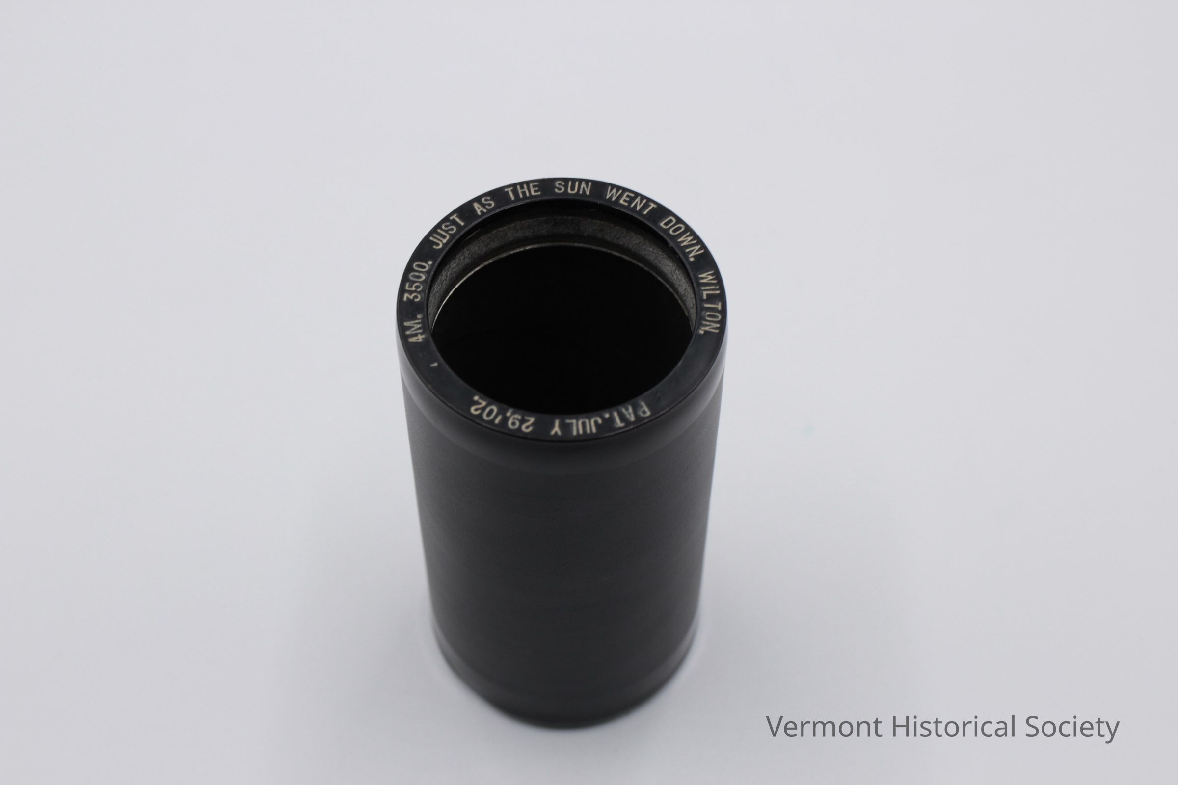 Blue phonograph cylinder with a cardboard case. The cylinder, or "record", is a hollow cylinder consisting of hard, blue, ridged celluloid around a concrete core. One edge of the cylinder is labeled in white with the words, "4M. 3500. JUST AS THE SUN WENT DOWN. WILTON. / Thomas A Edison PAT'D. 24".Use