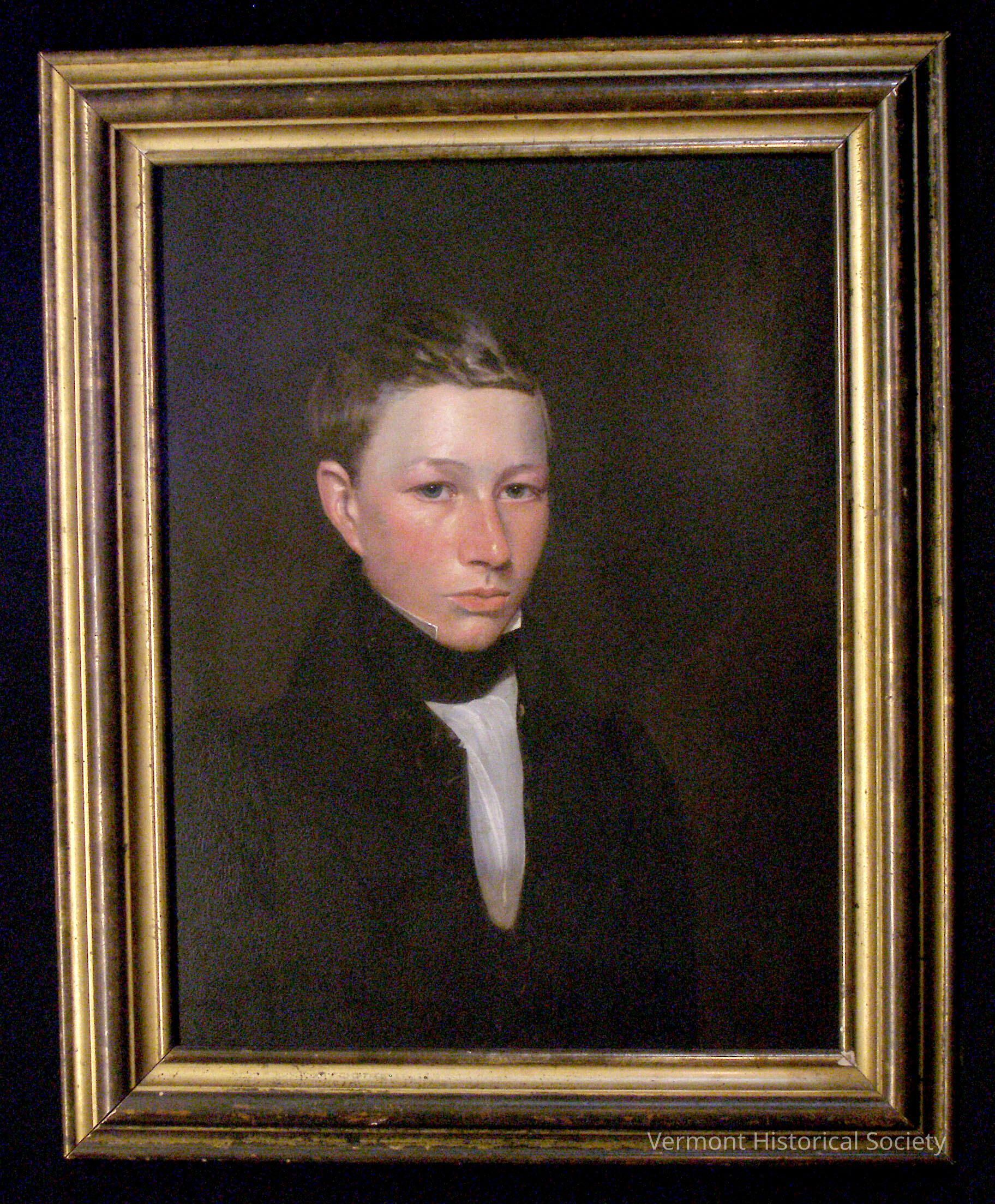 Portrait of a young man with short, blond hair. He is wearing a high-collared white shirt, black cravat, black vest, and black coat.Type of Painting