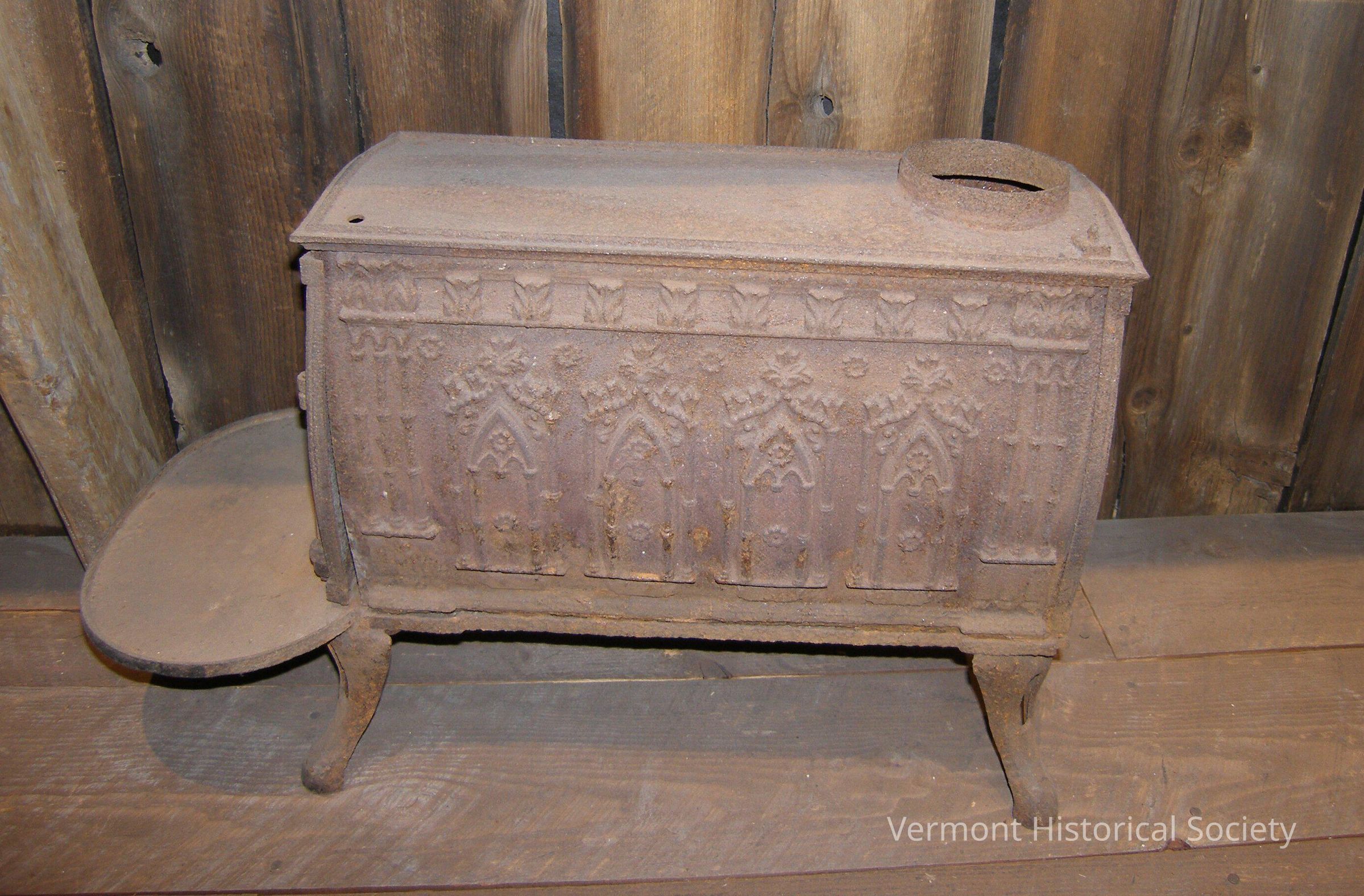 Cast iron wood-burning stove. The sides of the stove are molded with gothic ornamentation. There is an oval platform underneath the front door, which hinges open from the side. There is a chimney spout at the back of the top. The stove is marked, "S. H. Langdon CASTLETON" on the door.