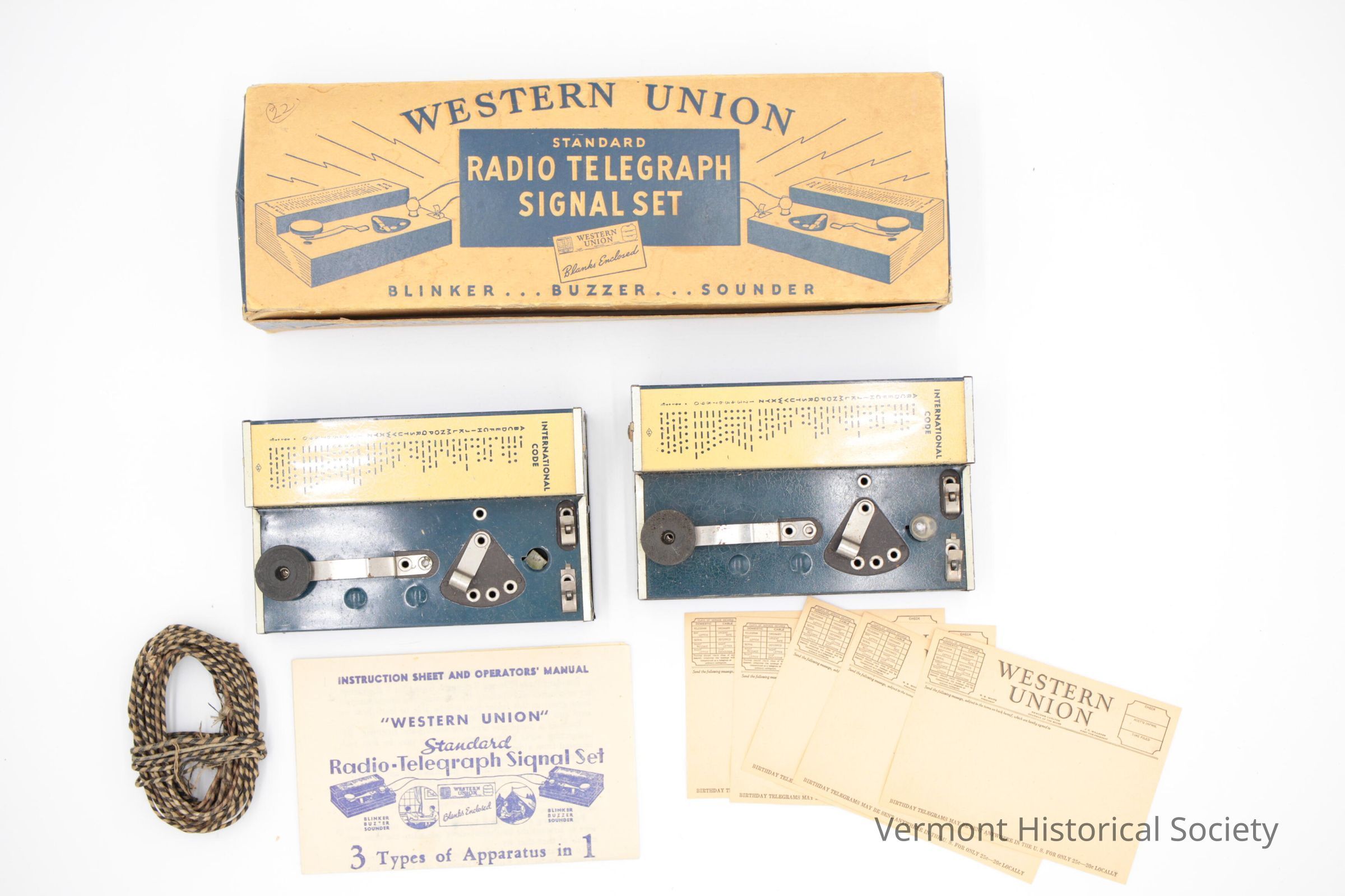 Mason used this telegraph set to train new recruits to the CAP. Though technologically surpassed by radio and other new communications devices at the time, during World War II the telegraph was still a crucial tool because of its familiarity and reliability. Telegraphs work by connecting and interrupting an electrical circuit. With each interruption, the device generates a noise – usually a click or a beep – that operators interpret in code. Cadets in the CAP would have learned to use the telegraph itself as well as Morse code and its accompanying shorthand, as seen here in the training materials.