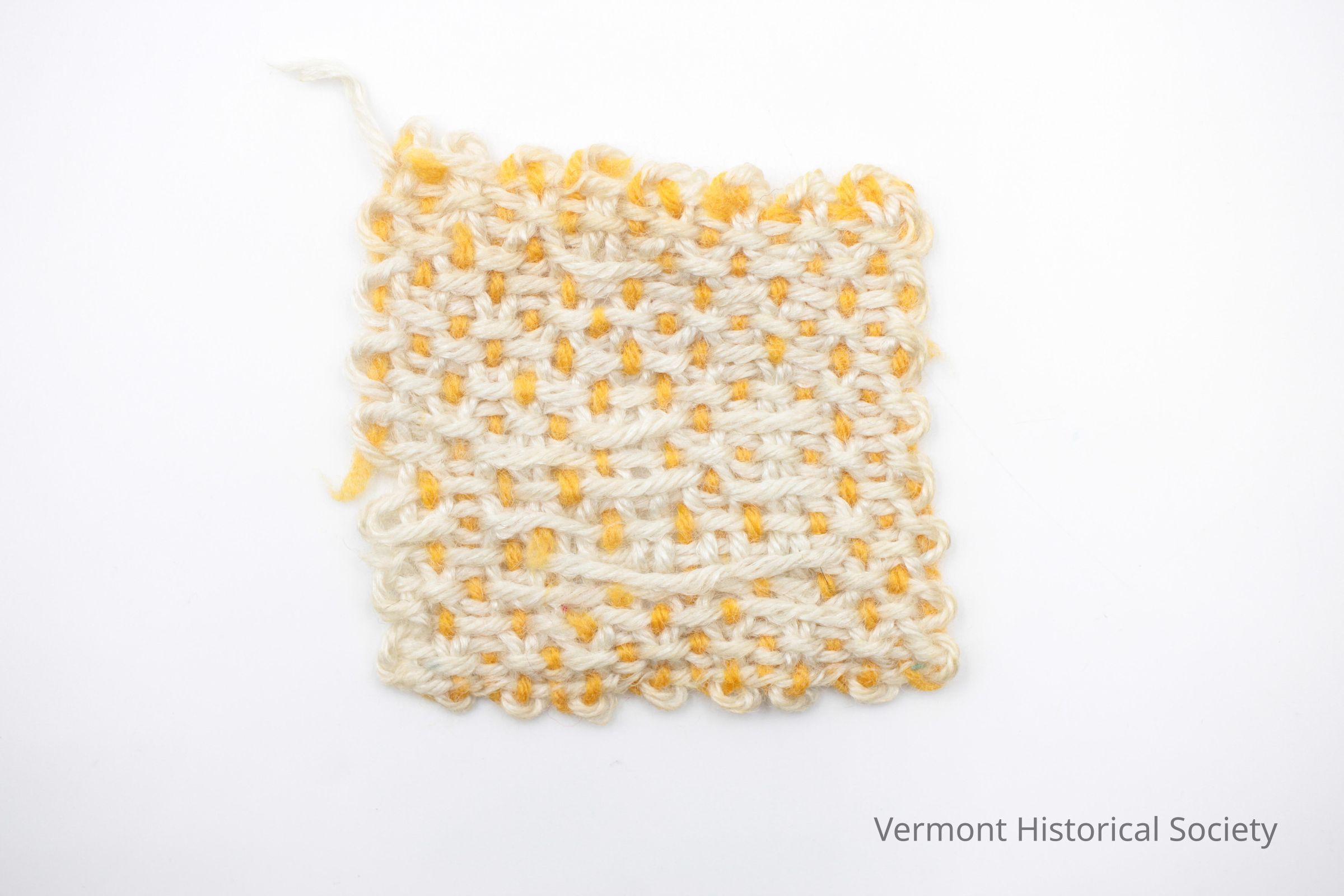Miniature rug sized for a dollhouse. The rug is woven with finger-weight yarn in yellow and white.Context