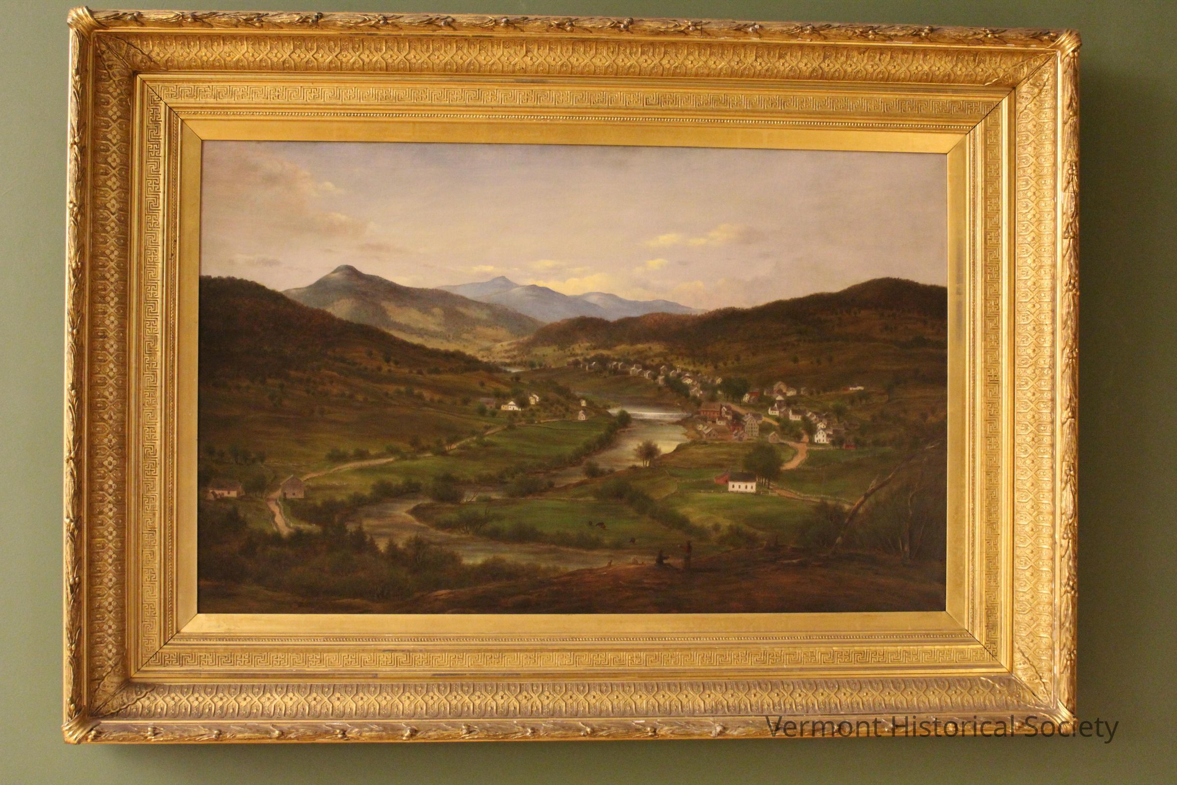 Oil painting of a landscape. The painting shows a green valley with a river in the center and mountains to the sides and in the background. Roads run along either side of the river and there is a large village on the right side. The painting is within an ornate gilded frame.Type of Painting