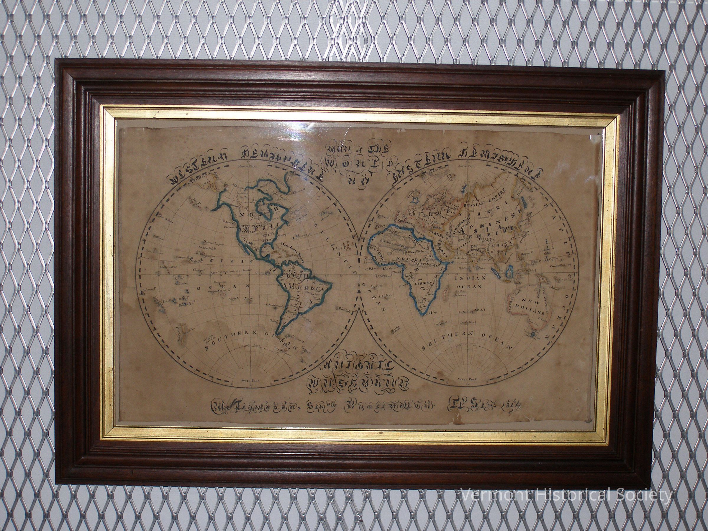 A coordinate grid covers both hemispheres, with lines appearing to display latitude and longitude. Numbers for latitude are displayed on a series of black and white lines on the edges of each hemisphere, and numbers for longitude are displayed along the equator line. In the middle of the map and above both hemispheres the text "MAP OF THE WORLD" is written in gothic cursive script. To the left and right of it, the text "WESTERN HEMISPHERE" and "EASTERN HEMISPHERE" are written above the above the western and eastern hemisphere respectively. At the center bottom, the authors name is written. Below that text is written "Mr. Thompson's seminary Burlington, September 1829." The entire map is contained within a frame with the inner layer colored gold and outer brown.Type of Drawing