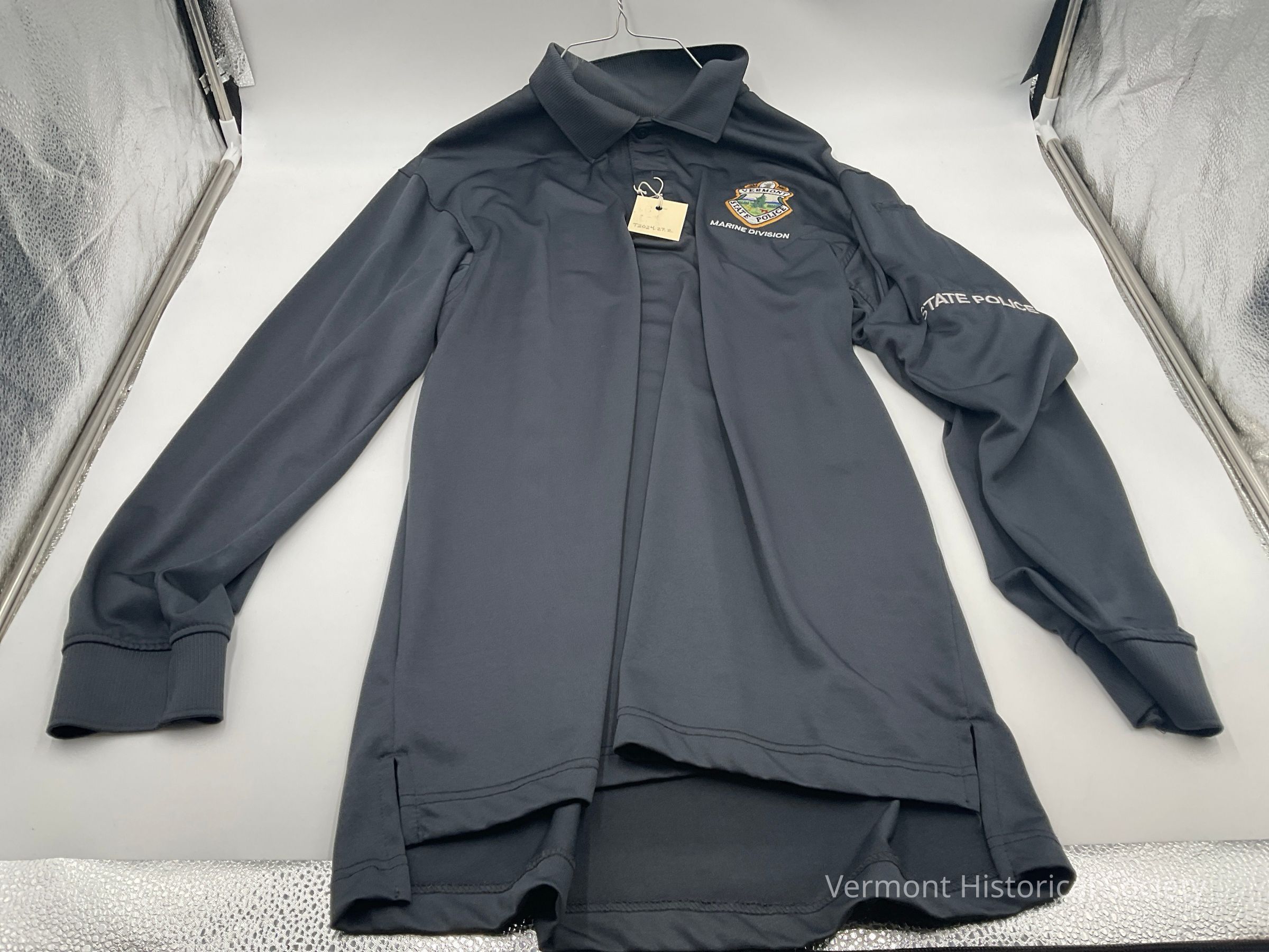 Gray, long-sleeved polo shirt with collar and two-button enclosure at the neck. A patch on the left breast says "Vermont State Police," and underneath the words, "Marine Division" are embroidered in white. The words, "State Police" are also embroidered in white on the left sleeve.Acquisition