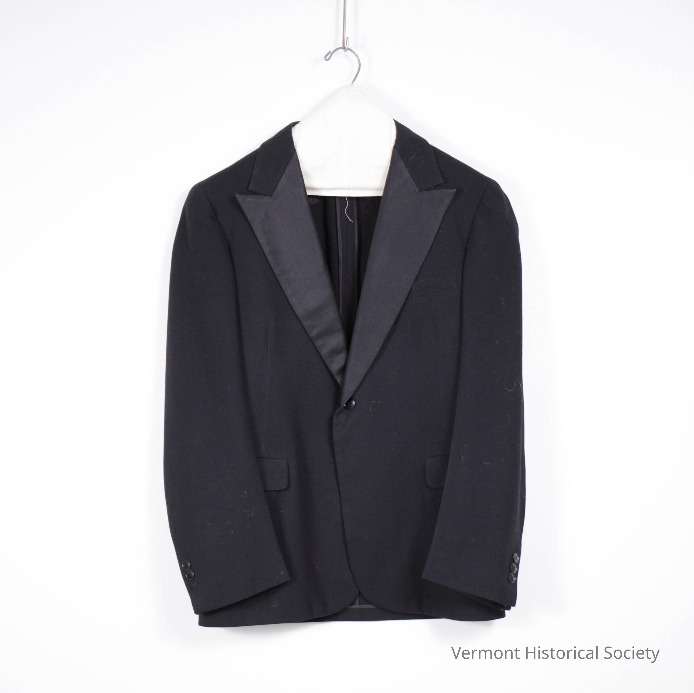 Three piece black tuxedo consisting of a jacket, vest, and pants. The jacket is made a wool with silk satin lapels. There are pockets on either side that secure with flaps. The center front secures with a single, black button. There is an interior pocket inside the right breast with a label that reads, "F. H. Rogers & Co., 161 N. Main Street, Barre, VT."