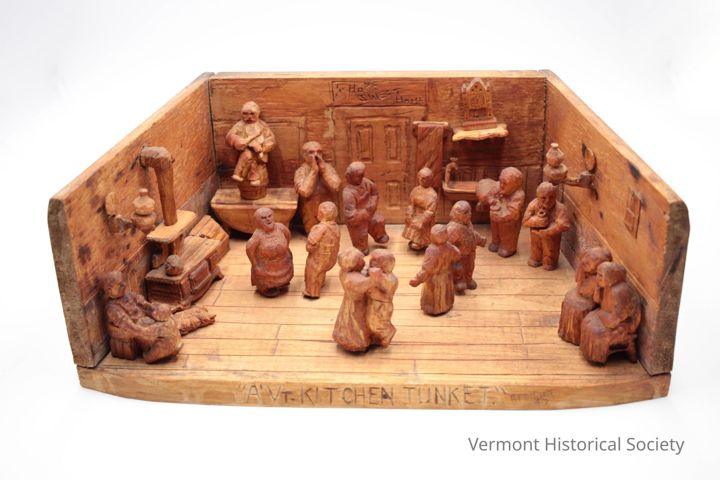 Wooden diorama scene showing several people dancing in a kitchen. The room, or box, is carved with the label, "A VT. KITCHEN TUNKET". The walls of the diorama are carved to represent a simple interior, with bead board or planking on the lower half of the walls, and a four-paneled door at the center back. From right to left, the scene includes a seated woman, a dog and puppies, a shelf of accessories, a stove, a fiddler atop a table, a step caller, four dancing couples, a clock on a shelf, two standing men, lanterns on a shelf, and two seated women.Context