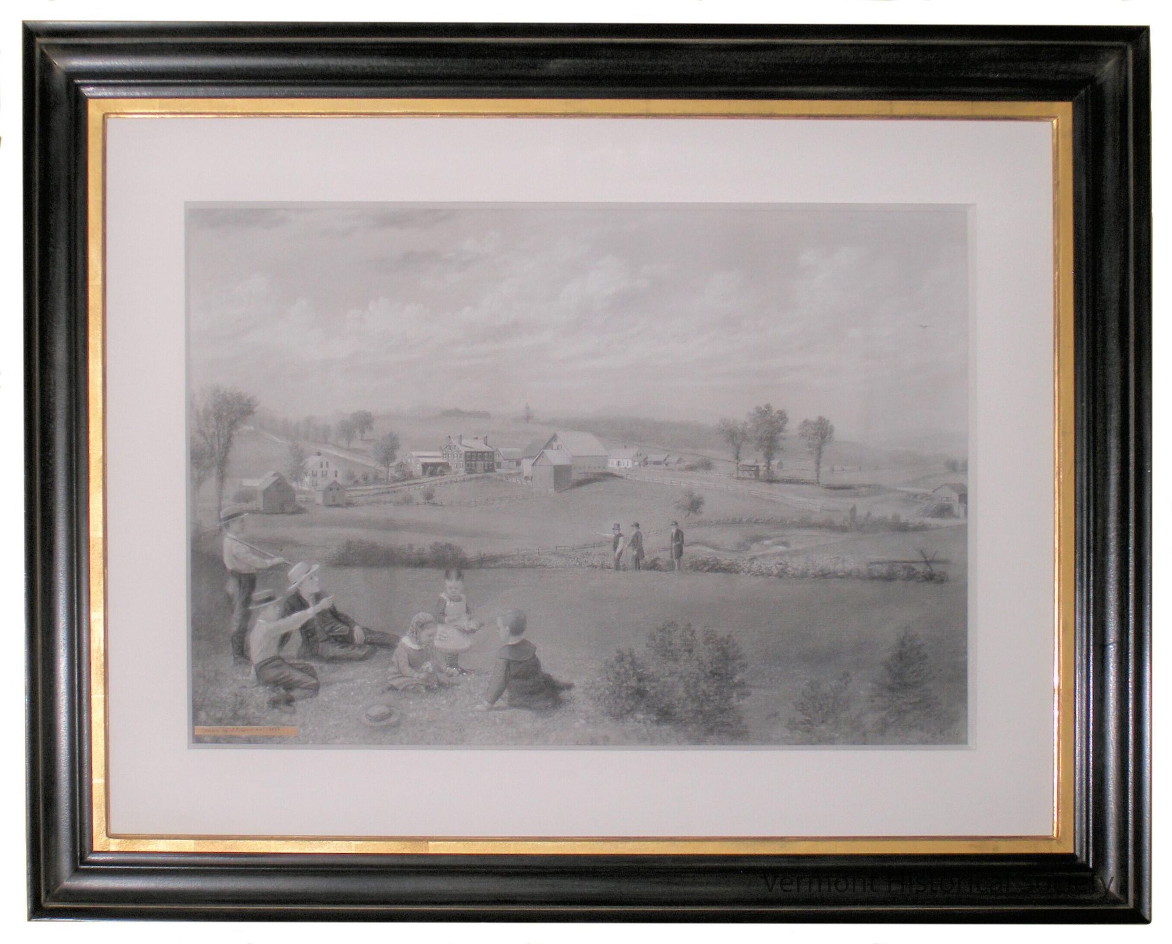 Charcoal landscape drawing showing a family of six lounging on the bank of a river. Three additional people walk along the opposite bank, and a small town centered along a road can be seen beyond them. The buildings consist primarily of white structures with the notable exception of a stately brick house at the center. The landscape consists or rolling hills, partitioned with fences and sparsely dotted with trees.Artwork Details