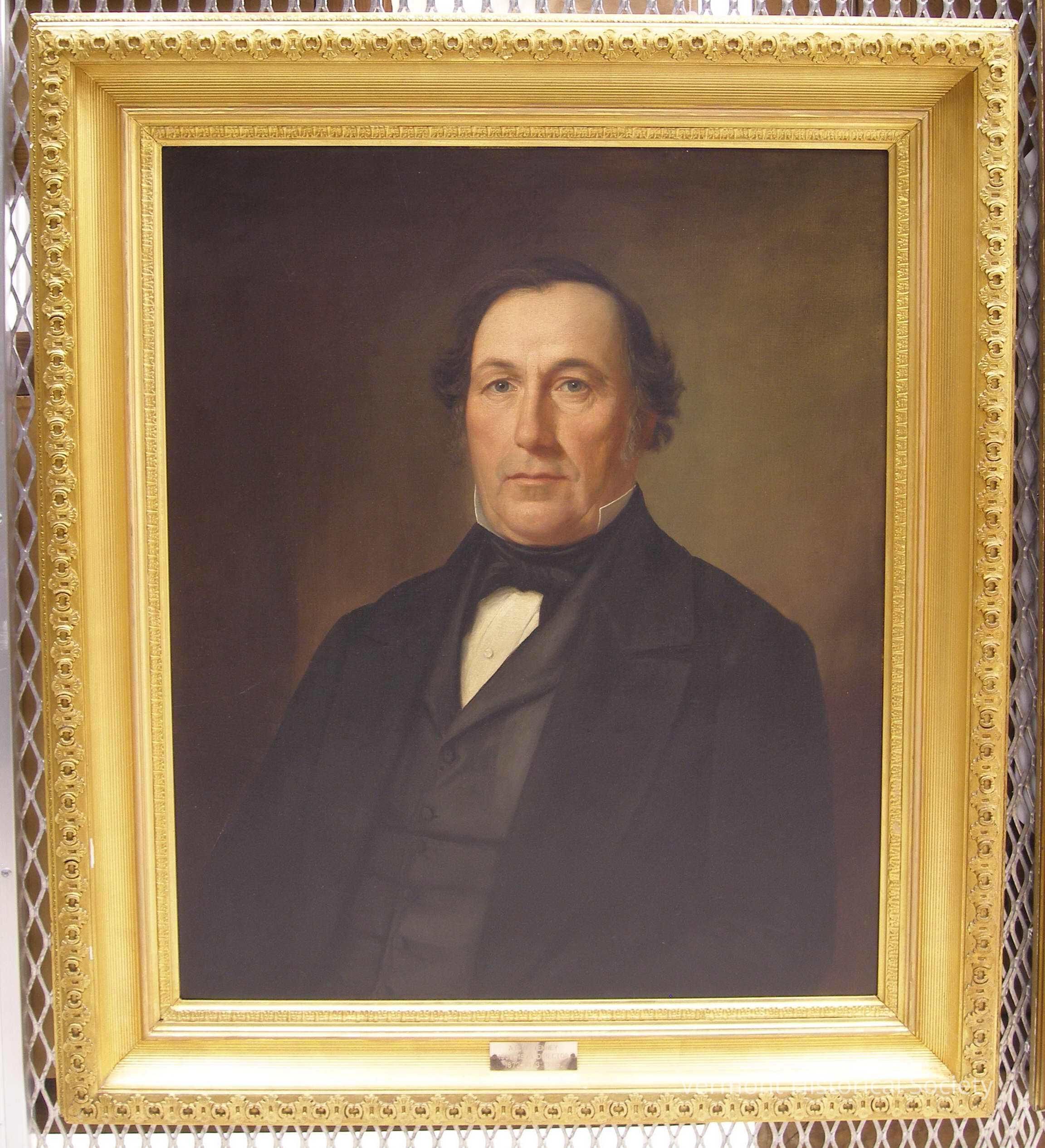 This artwork is an oil painting on canvas depicting a portrait of a middle-aged white man with dark hair. He is shown wearing a suit consisting of a black jacket, black vest, black bowtie, and a white shirt. The background of the painting is brown in color. The painting is housed in a gilded frame.Artwork Details