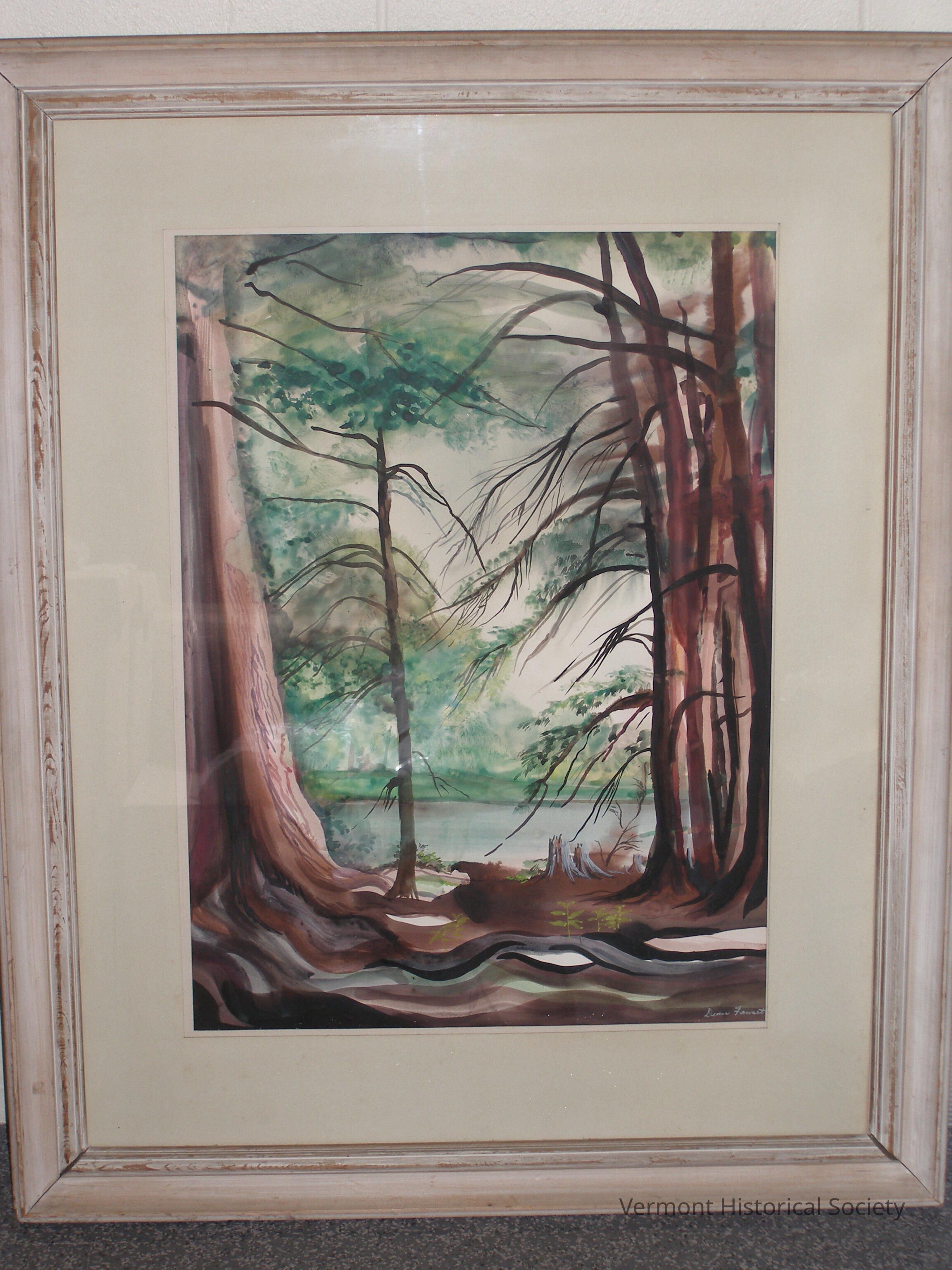 Watercolor painting showing a wooded scene with a lake or pond. In the along the left and right edges of the composition are large, leafless trees. The land on the other side of the water is green.Acquisition