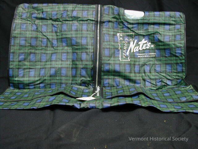 Blue-and-green plaid printed plastic garment bag. It has a metal zipper down the center front, and there is a clear plastic window on the right. Printed in gold is the label, "NATES INC. Vermont's Largest Men's Clothier" with an outline map of the state of Vermont.